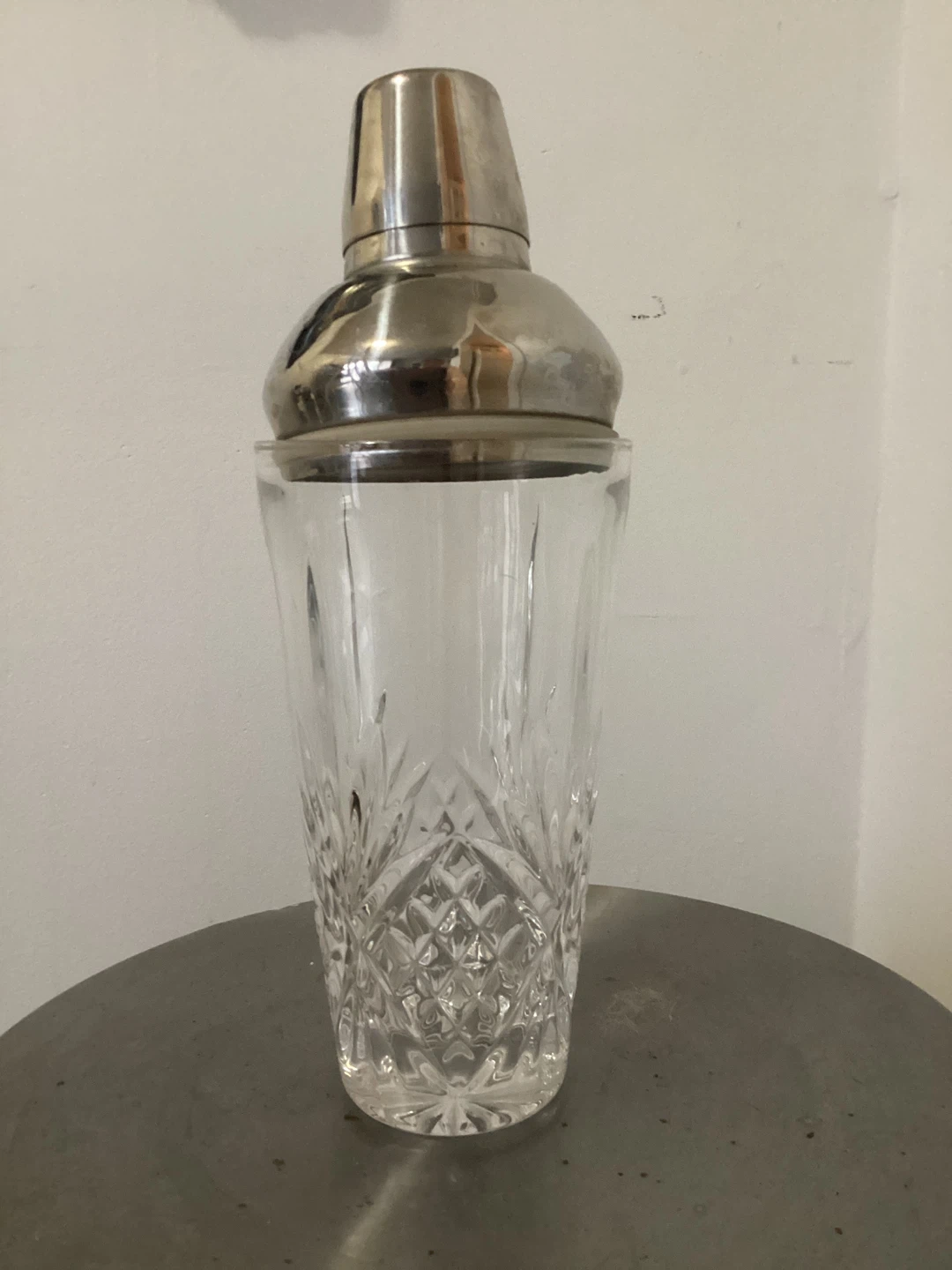 A crystal cocktail shaker with a metal strainer and cap. The glass tumbler features a diamond cut design. This shaker's components are made of stainless steel.