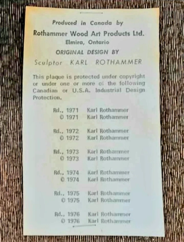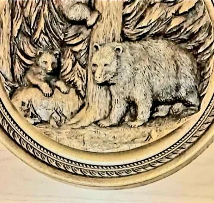 Rare 1970s Original,Authentic Karl Rothammer wooden sculpture featuring a bear and cubs in a detailed, round, rope-bordered design. This vintage piece, produced in ON Canada by Rothammer Wood Art Products Ltd., measures 36 cm in diameter. It's a unique collectible with the original design by sculptor Karl Rothammer, protected under copyright since the early 1970s. This piece is in very good condition.