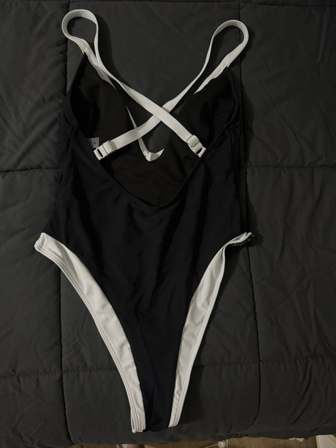 This one-piece swimsuit is black with white trim and features a plunging neckline with criss-cross straps at the back. It's made of a stretchy material for a comfortable fit. Perfect for hitting the beach or pool!