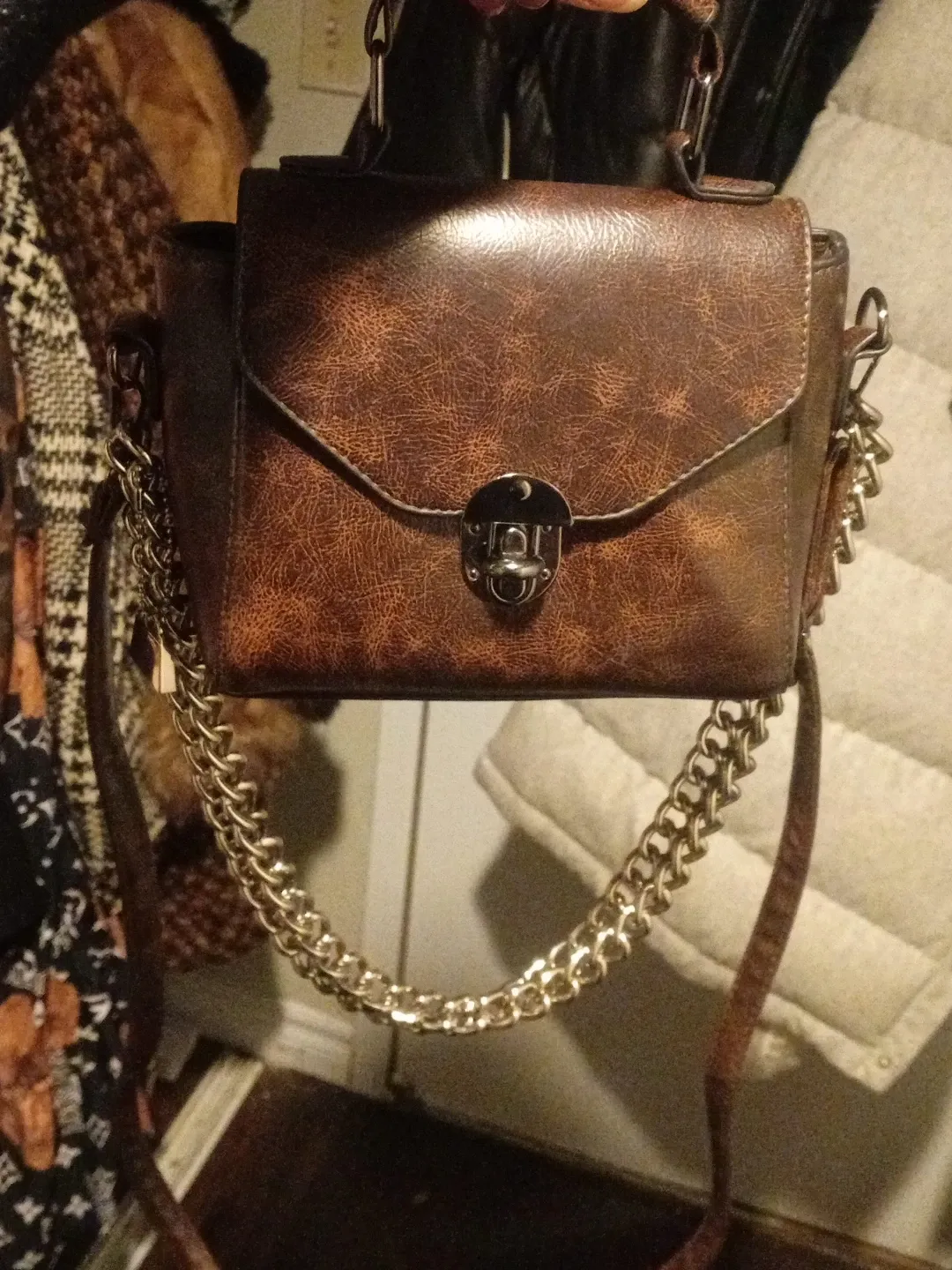 This is a stylish brown faux leather handbag. It features a turn-lock closure and a brown strap. The distressed finish gives it a vintage look! It's great for adding a touch of flair to any outfit.