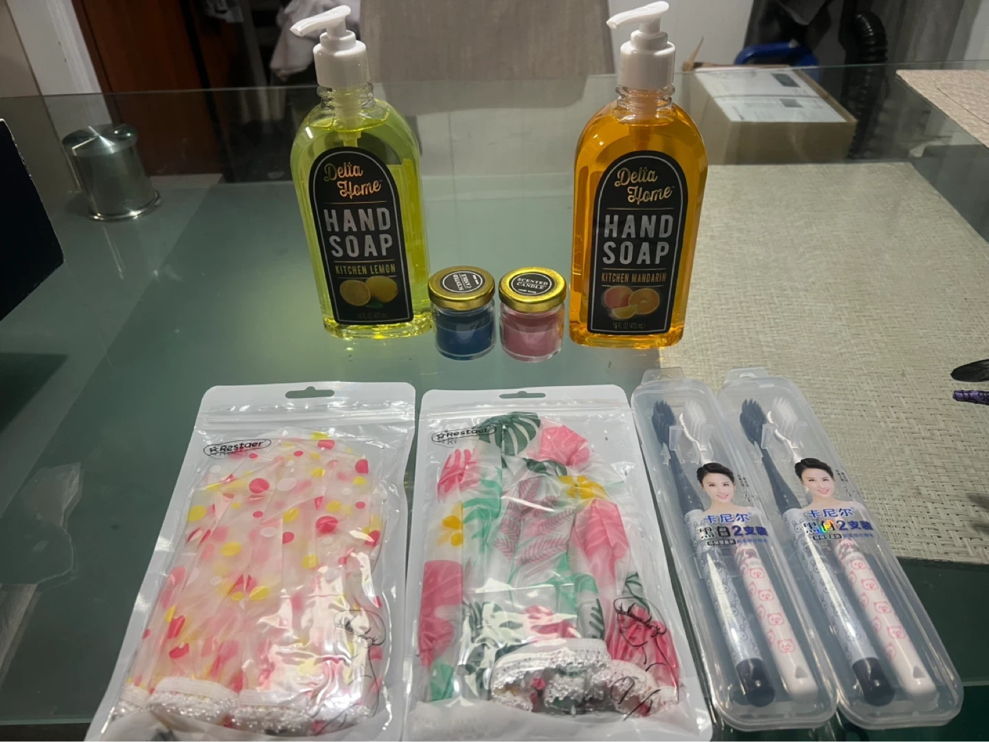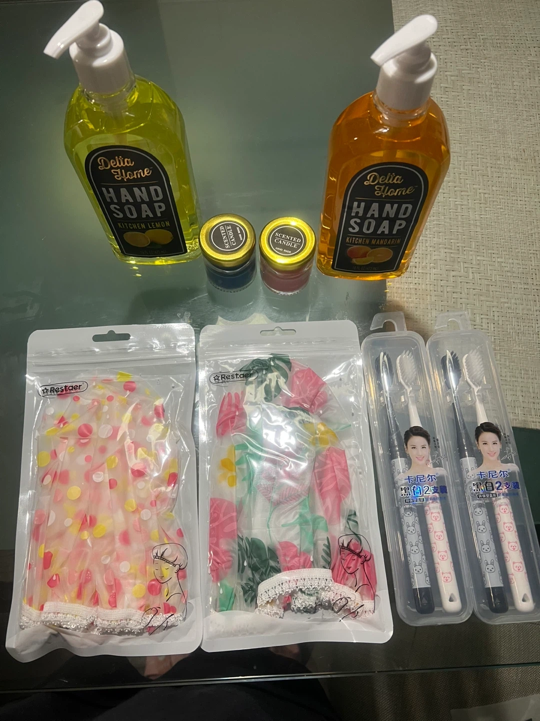 Includes two bottles of Delia Home Kitchen Hand Soap in Lemon and Mandarin scents. Also contains two scented candles. Additionally, there are three packs of bath accessories, including shower caps plus toothbrushes in cases.