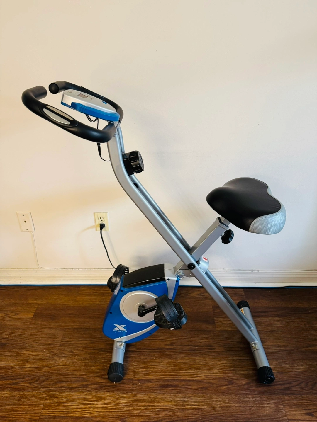 Folding exercise bike, great for a small space. Includes a digital monitor that tracks time, speed, distance, and calories burned. Adjustable seat height. Adjustable resistance.