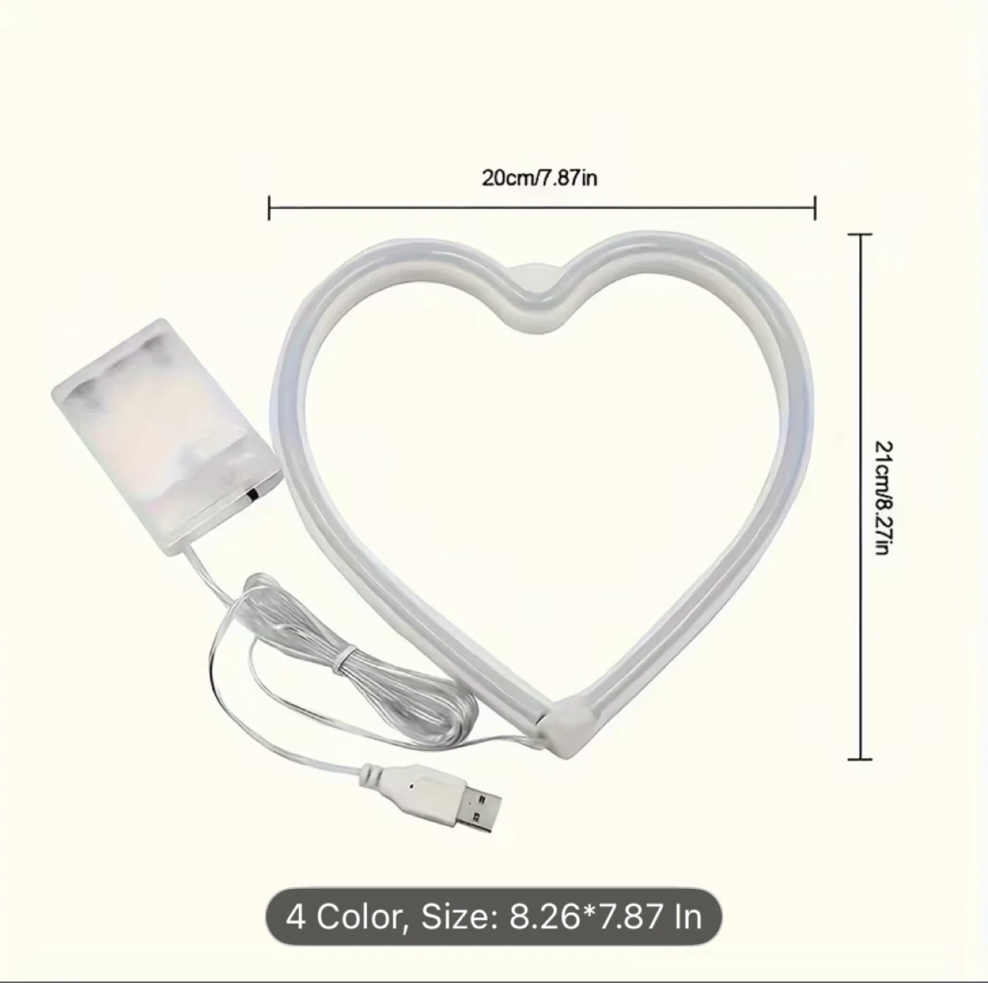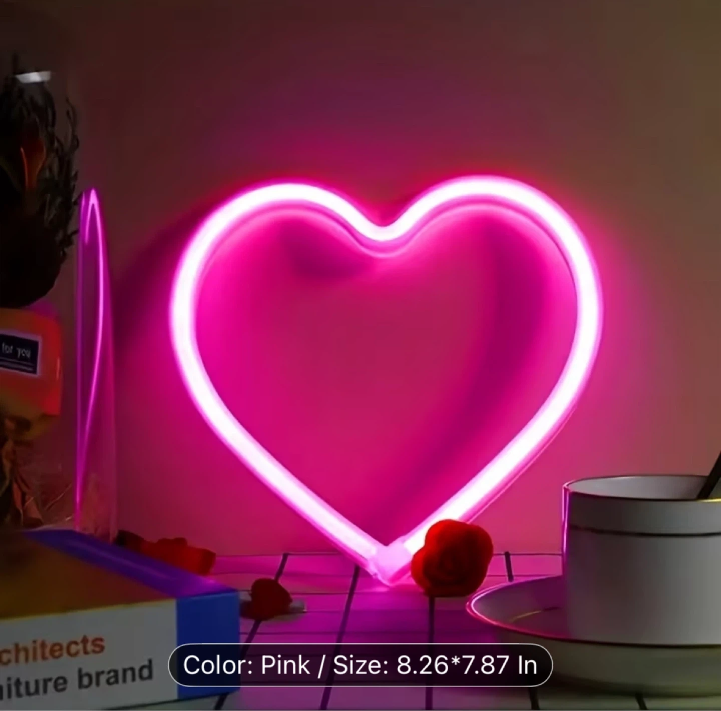 This is a pink heart-shaped neon sign light. It's powered by USB and measures 8.26 inches by 7.87 inches. Adds a nice glow to any room or window decor.