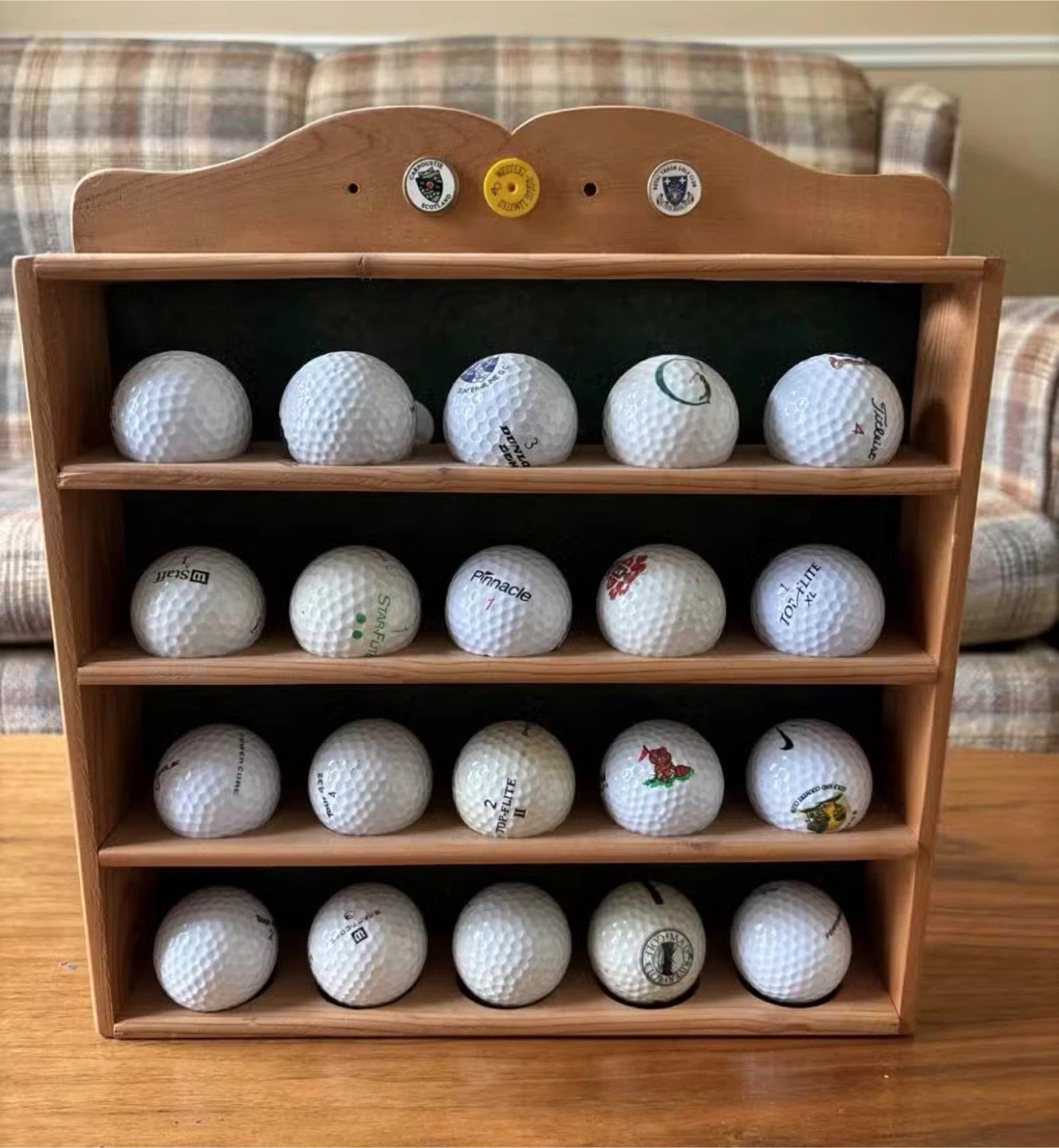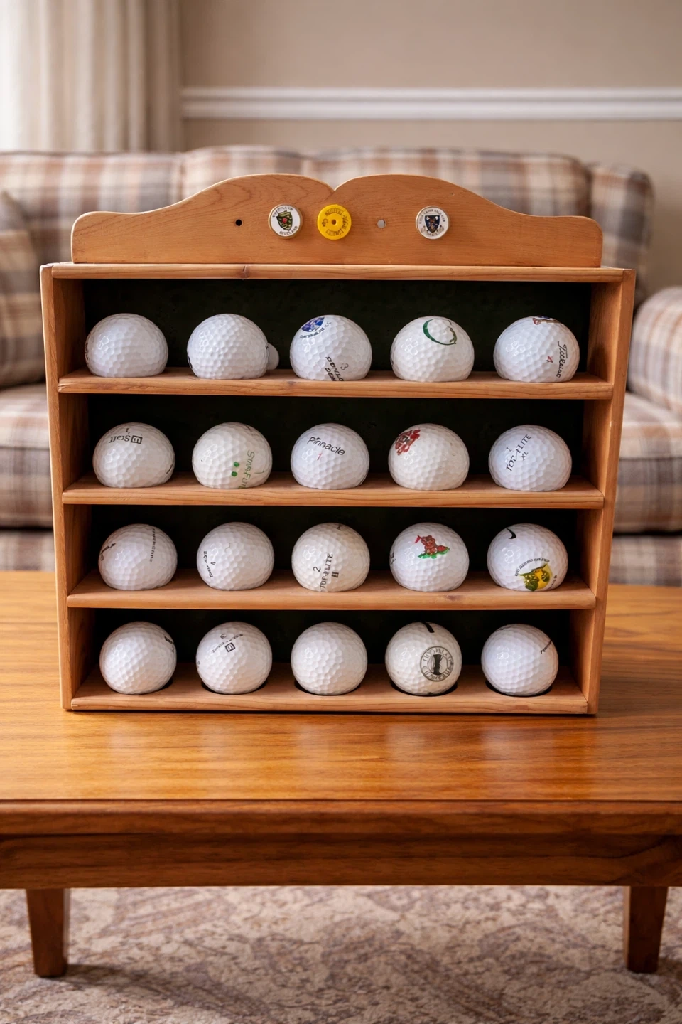 Wooden display stand with four shelves holding assorted golf balls. Some balls have visible branding like Pinnacle and Titleist. This stand is perfect for showcasing a golf ball collection or for display in a den.