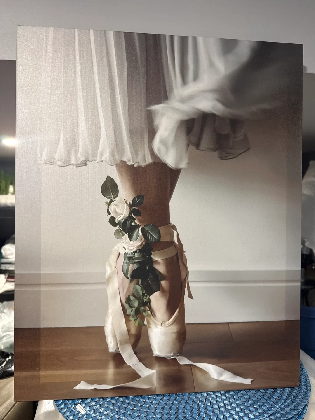 This canvas wall art features a close-up of a ballet dancer's feet in pointe shoes, adorned with roses and vines. It depicts a delicate ballet skirt and the satin ribbons of the shoes. The artwork is printed on canvas.