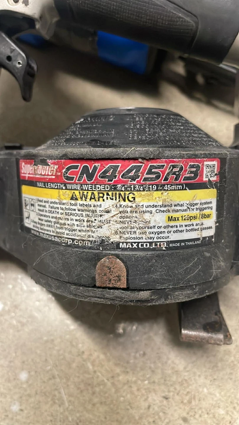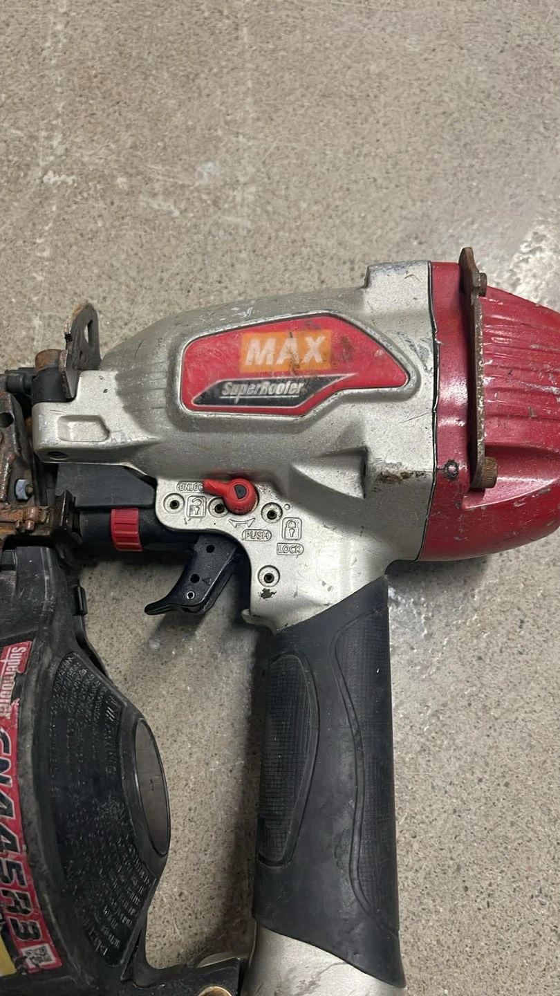 This is a MAX CN445R3 SuperRoofer coil nailer. It's designed for wire-weld nails up to 1-3/4 inches. The tool operates at 70-120psi.Don't be fooled by the rust, the nailer works great.
