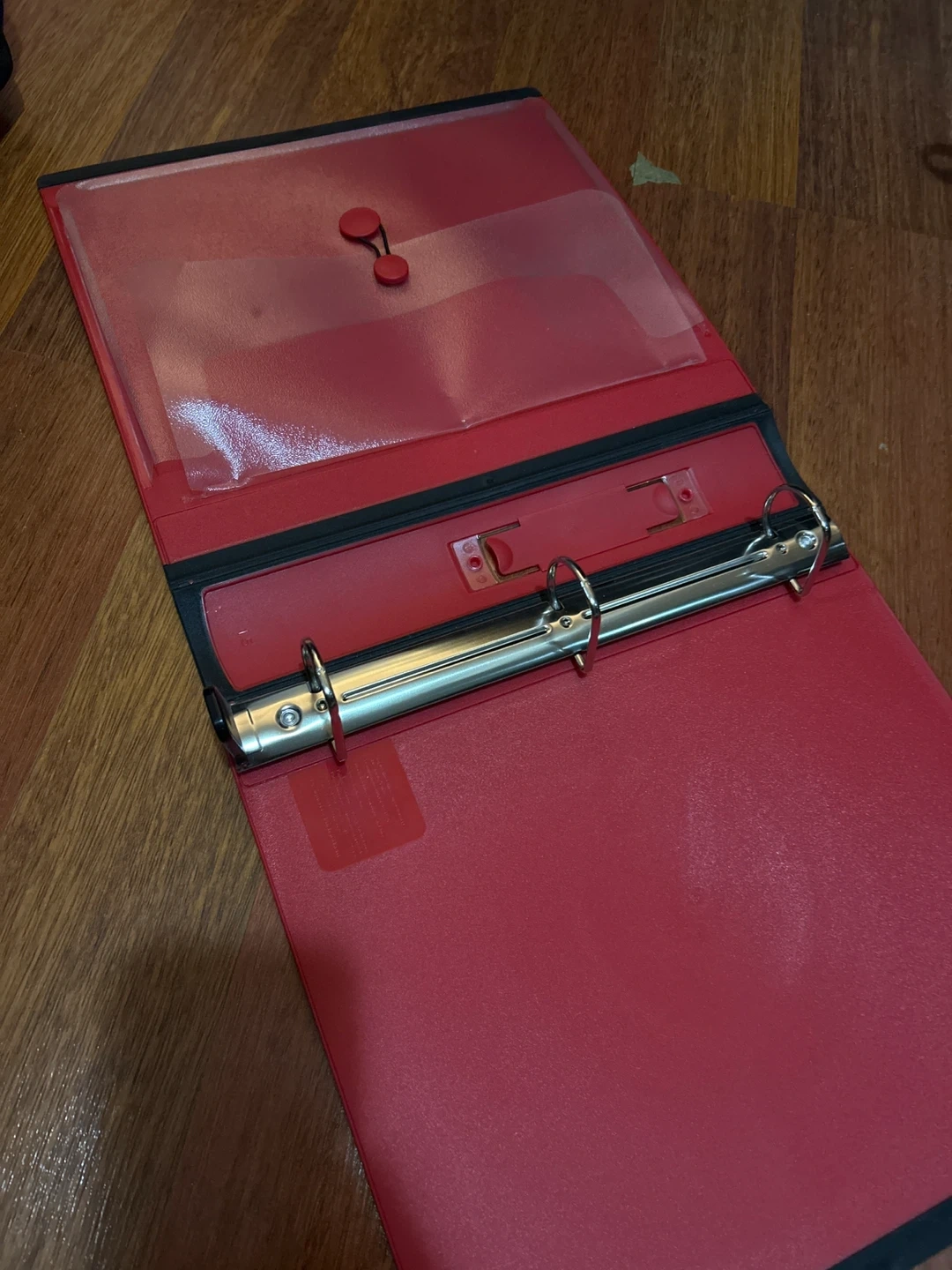 This red 3-ring binder features a durable cover and handy portfolio pockets inside. It's great for organizing documents and projects. Comes with a secure button closure.