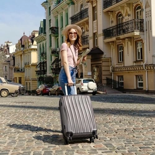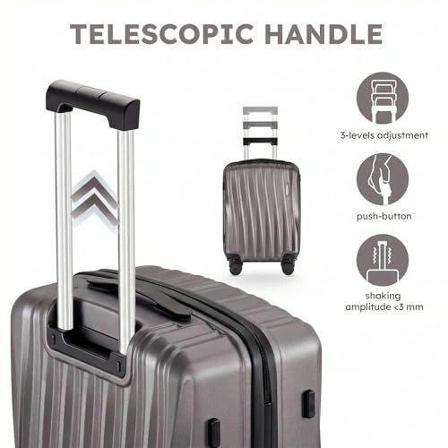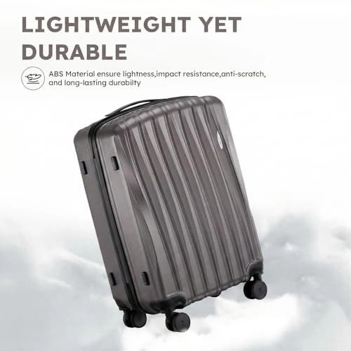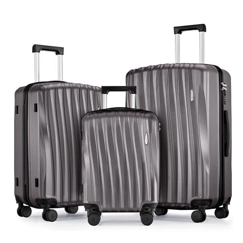 This is a stylish and durable 3-piece Suitour luggage set featuring a unique seashell arc design. The set includes a 19" carry-on, a 23", and a 27" checked suitcase. Made from high-gloss ABS hardside material, it's built to protect your belongings. The luggage features smooth and quiet 360° spinner wheels for easy maneuvering, a comfortable telescoping handle with multiple locking positions, and a reinforced side stand. Zippers are smooth-gliding and there's a built-in combination lock for basic security. The nesting design allows for 80% space saving when stored. Perfect for various trips, from short getaways to family vacations.