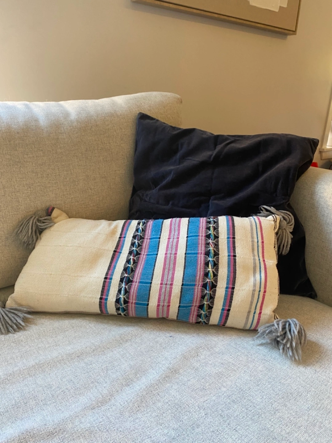 Selling two decorative throw pillows. One is a velvet dark blue and the other is a striped pattern with blue, pink, and white. They would look great on a couch or bed!