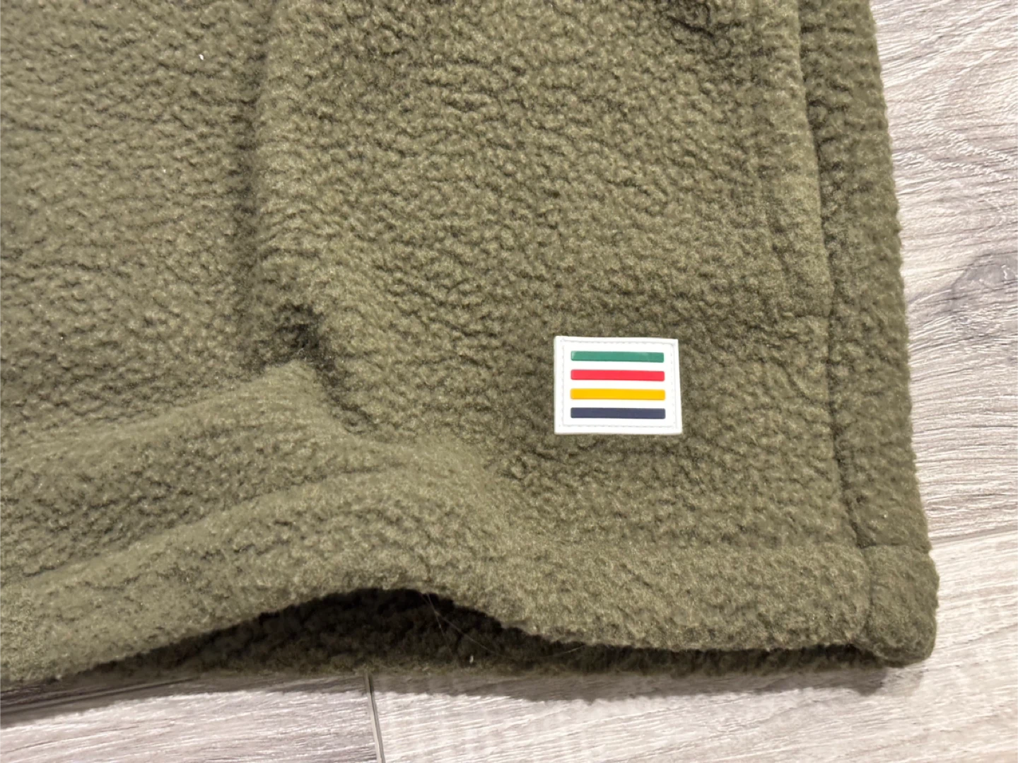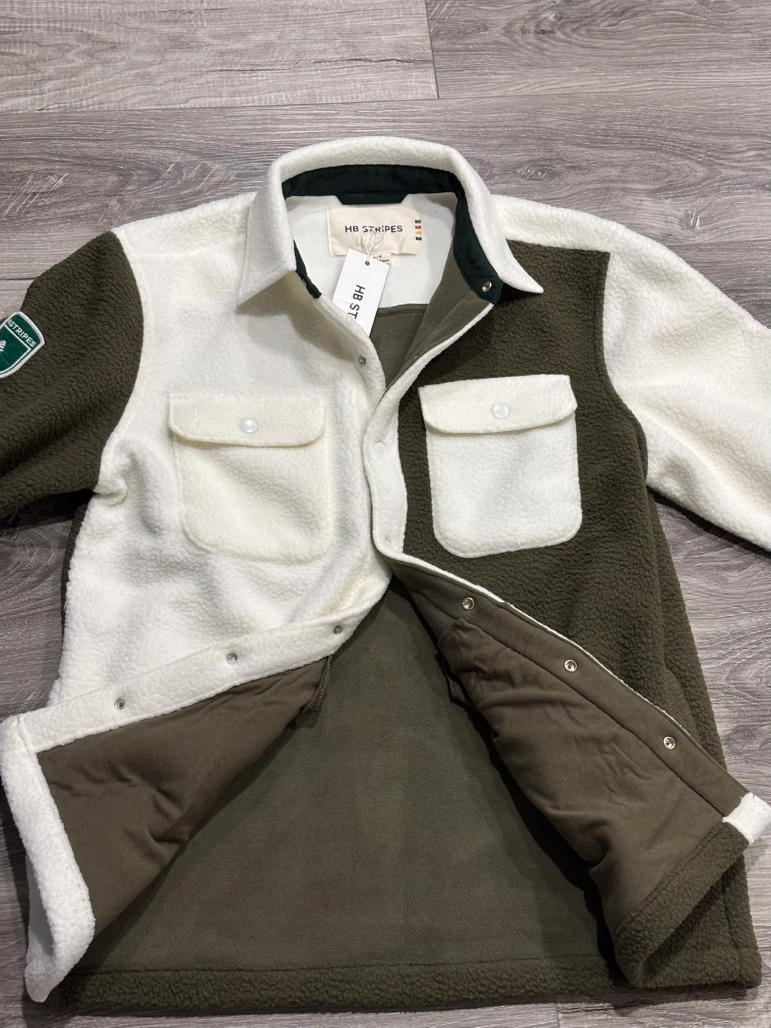 Cozy HB Stripes fleece shirt jacket in size small! This unisex jacket features a unique colour block design with olive green and white. Perfect for layering or wearing on its own during cooler weather.