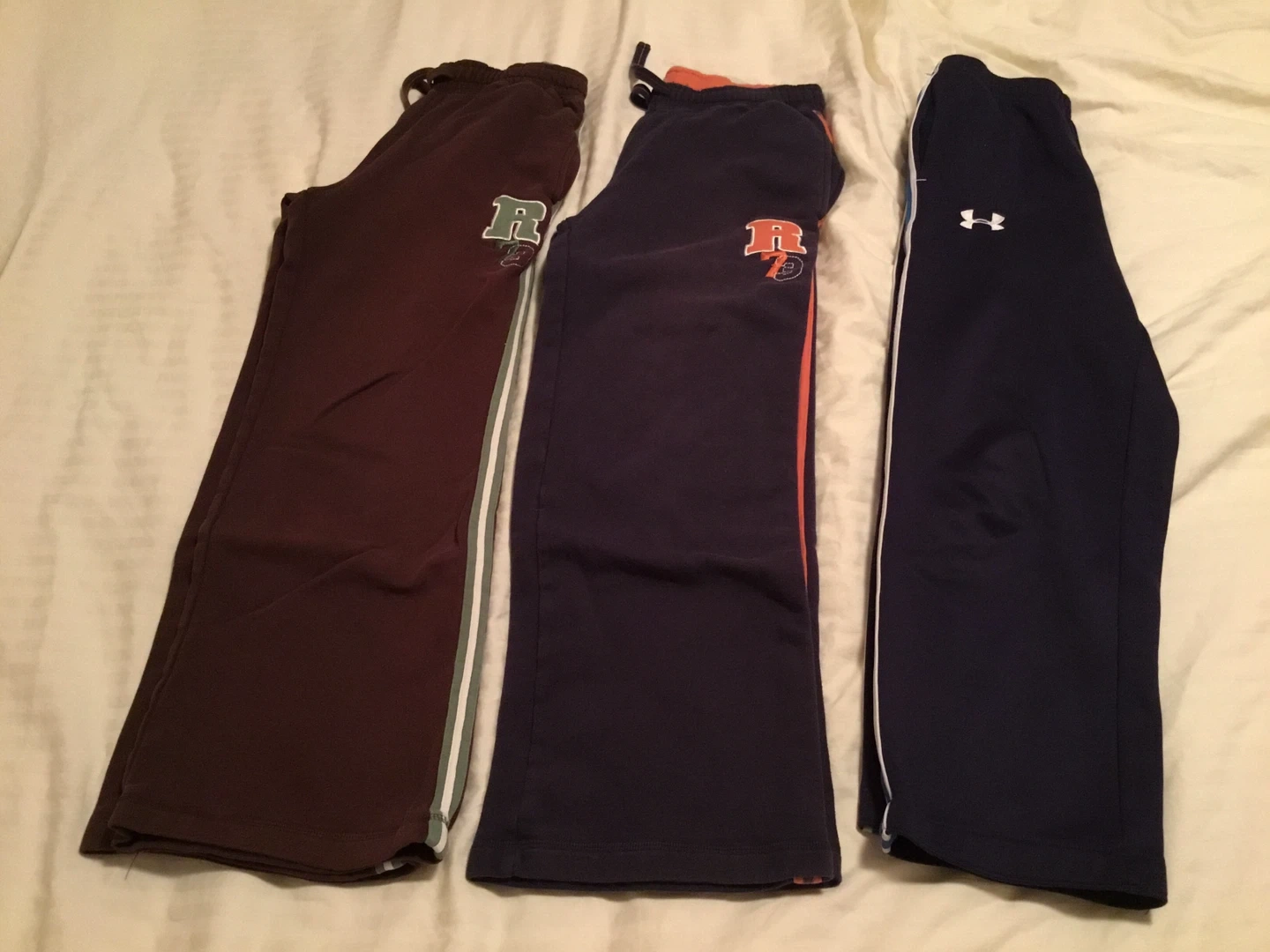 Selling a lot of three pairs of sweatpants. Included is a pair of Under Armour sweatpants, along with two other pairs. They're all in good condition and ready for a new home!
