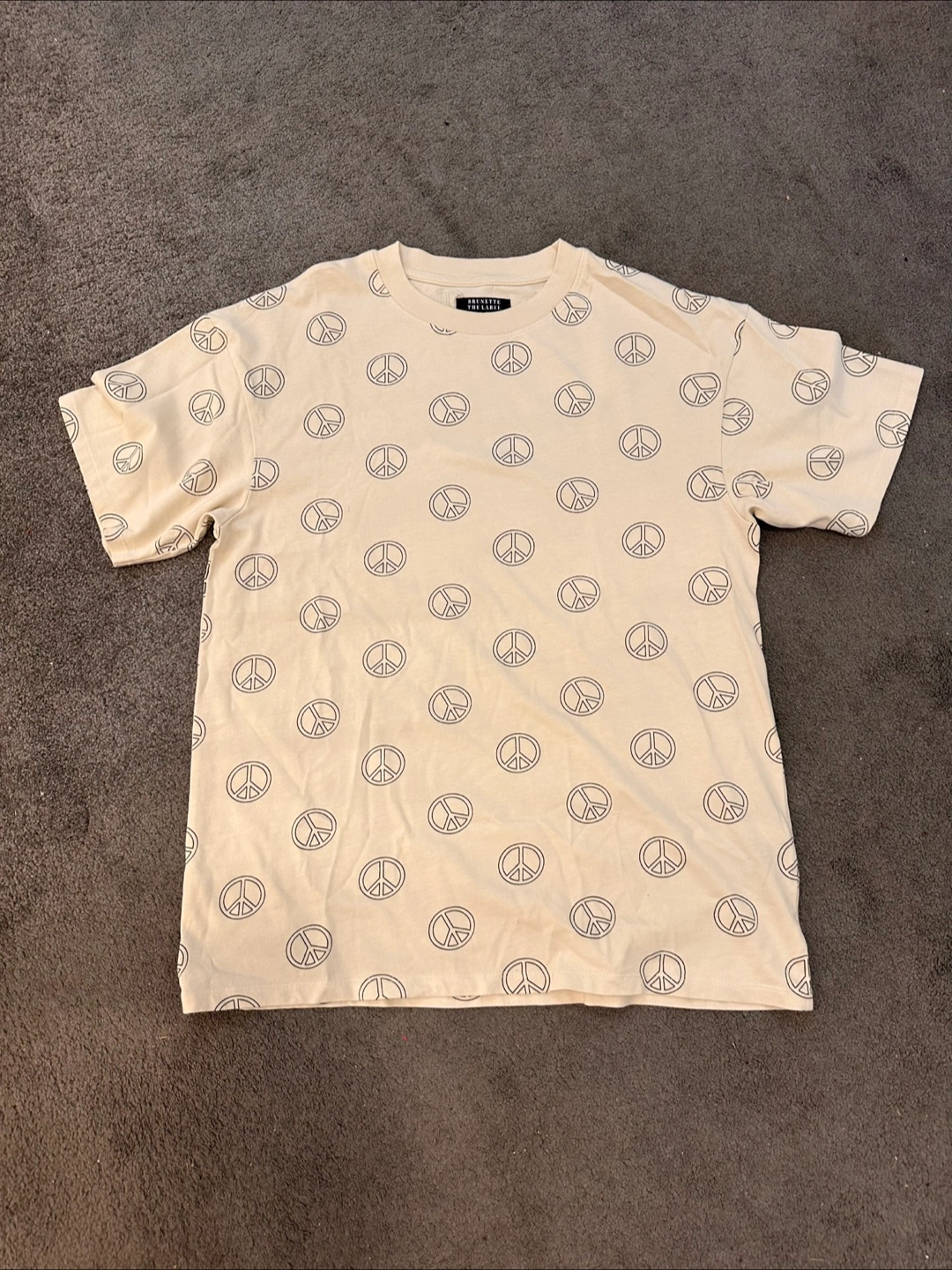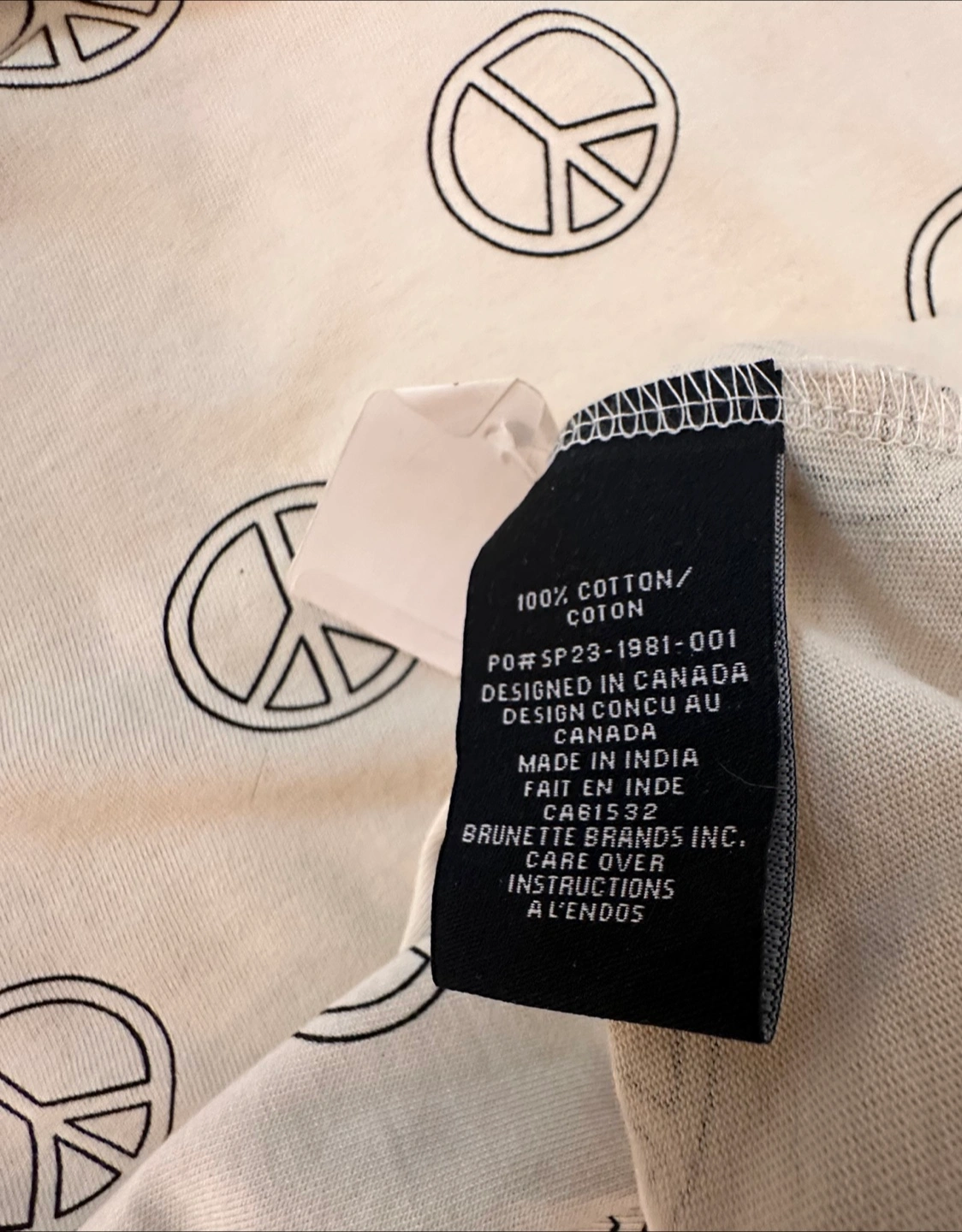 Cute t-shirt with an all-over peace sign print! It's made of 100% cotton and designed in Canada. Perfect for a casual, comfy look