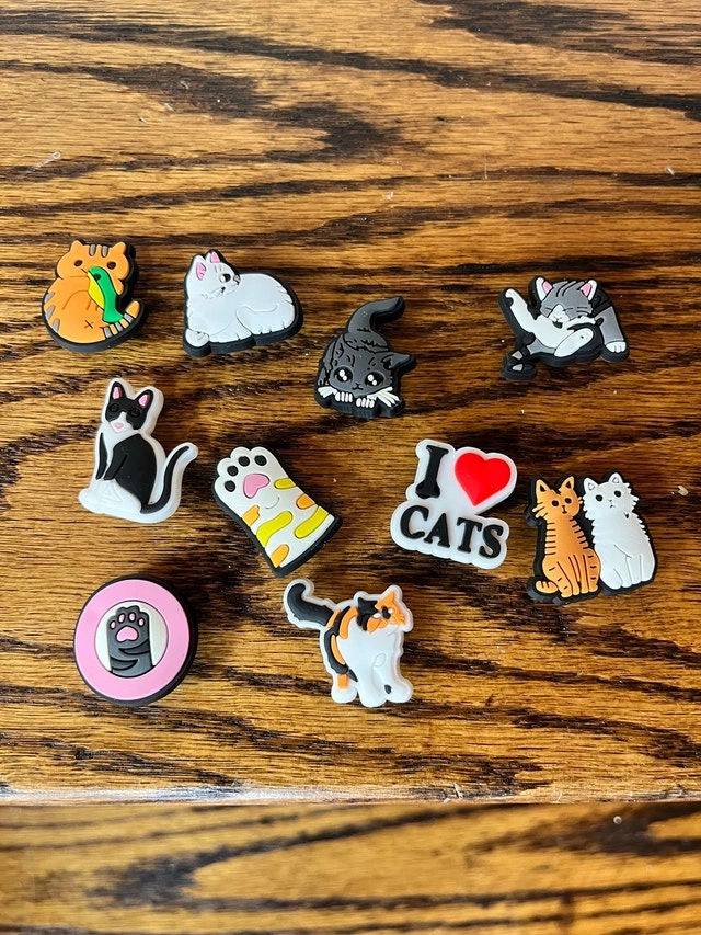 Accessorize your Crocs with these brand new cute cat-themed charms. These fun and quirky jewels are perfect for any cat lover looking to add a personal touch to their footwear. They easily attach to Crocs and make a delightful statement. Specifications: