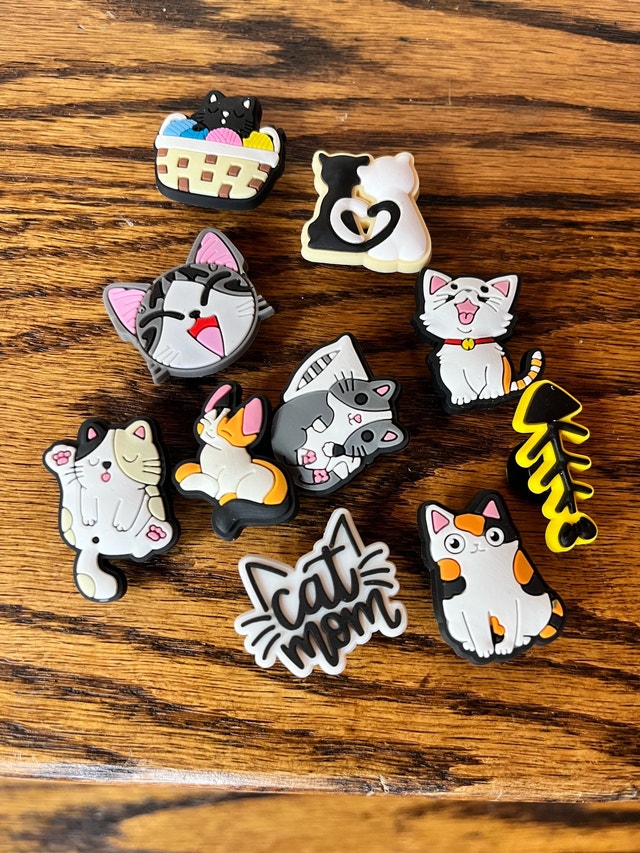 Accessorize your Crocs with these brand new cute cat-themed charms. These fun and quirky jewels are perfect for any cat lover looking to add a personal touch to their footwear. They easily attach to Crocs and make a delightful statement. Specifications: