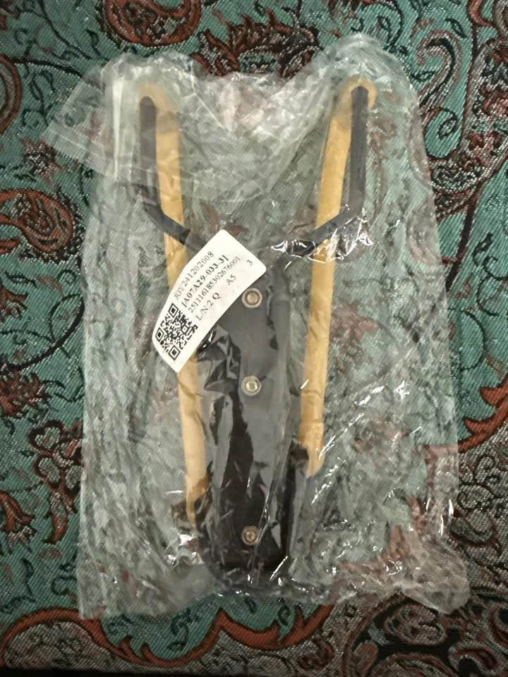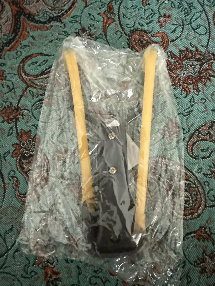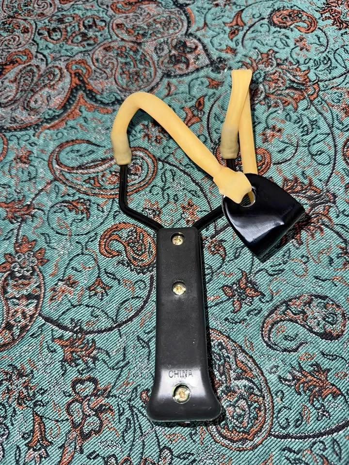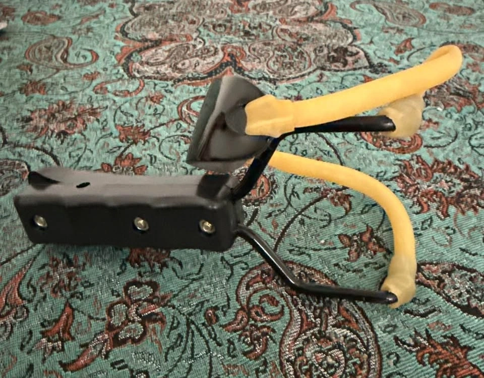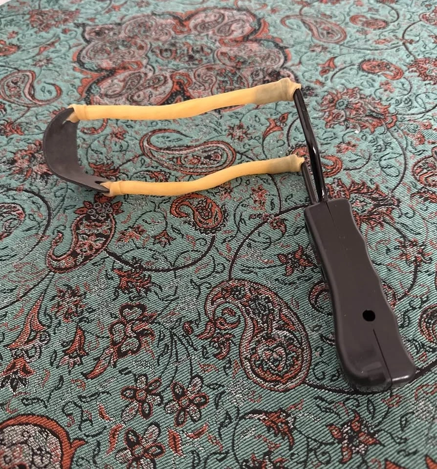 Compact black slingshot with wooden-style grips and strong rubber tubes. Ready for target practice or backyard fun!
