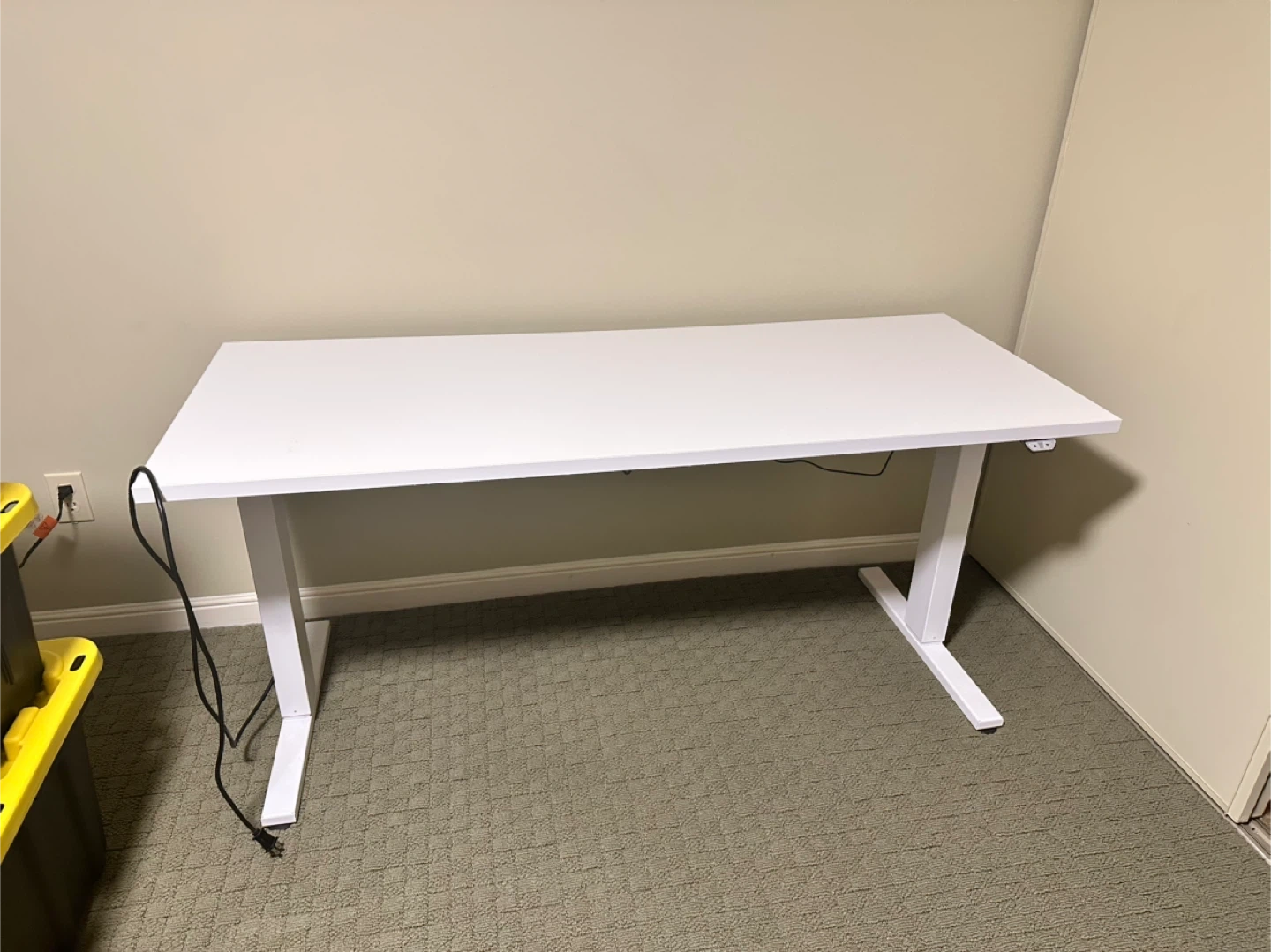 This is a white electric standing desk. It's powered and has adjustable height controls. The desktop is spacious for your work setup.