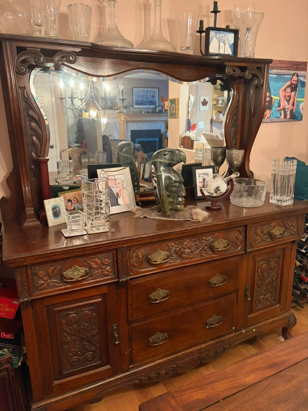 This antique sideboard features intricate carvings. It has multiple drawers and cabinet spaces for storage. The attached mirror adds a decorative touch, making it a beautiful statement piece for any dining room.