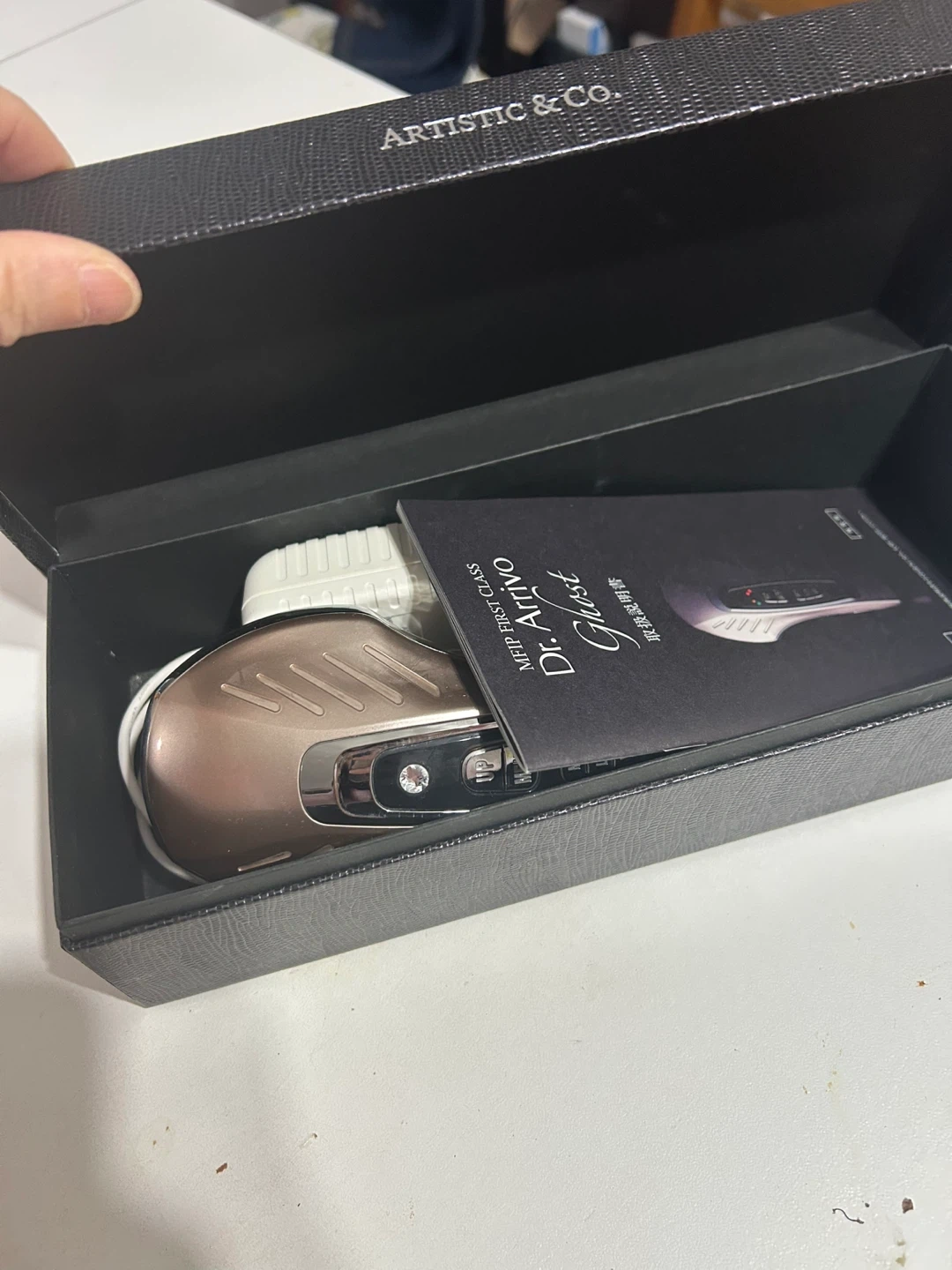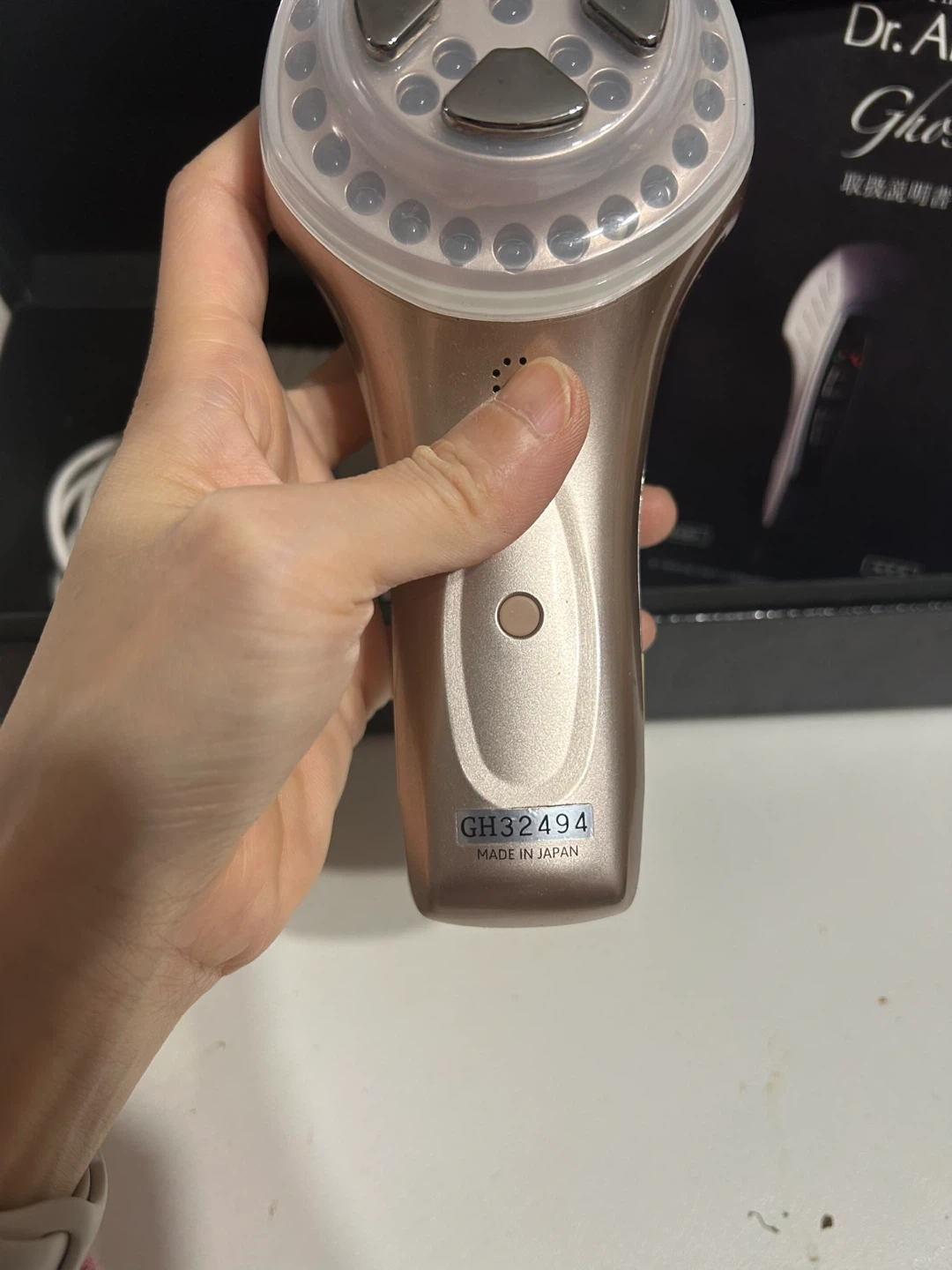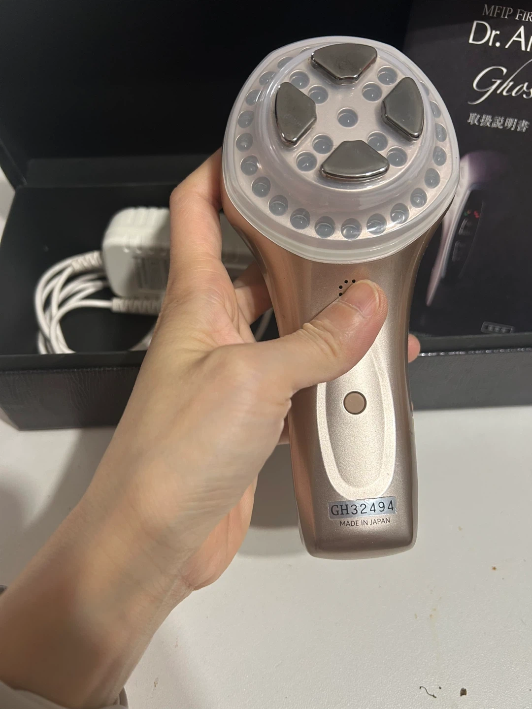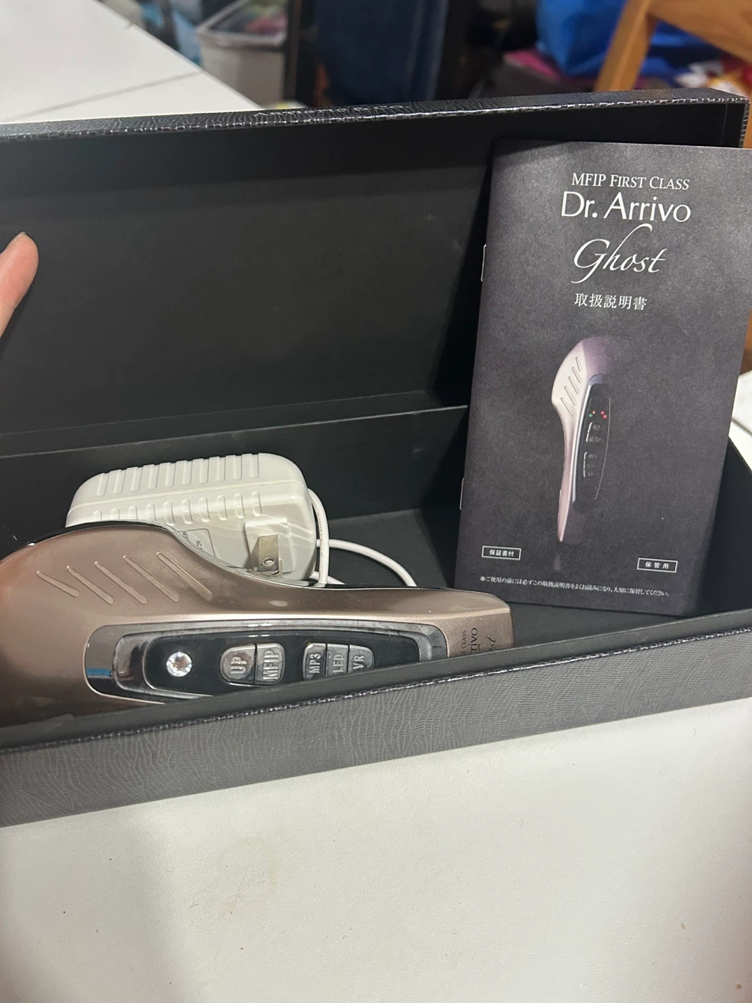 This is the Dr. Arrivo Ghost MFIP First Class beauty device. It's made in Japan. Includes the device, charging adapter, and instruction manual.