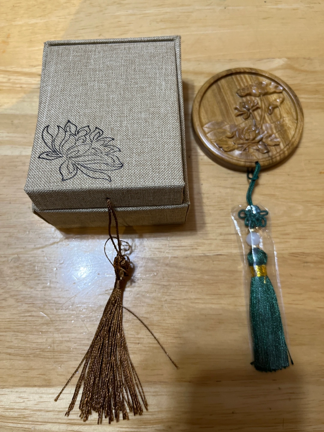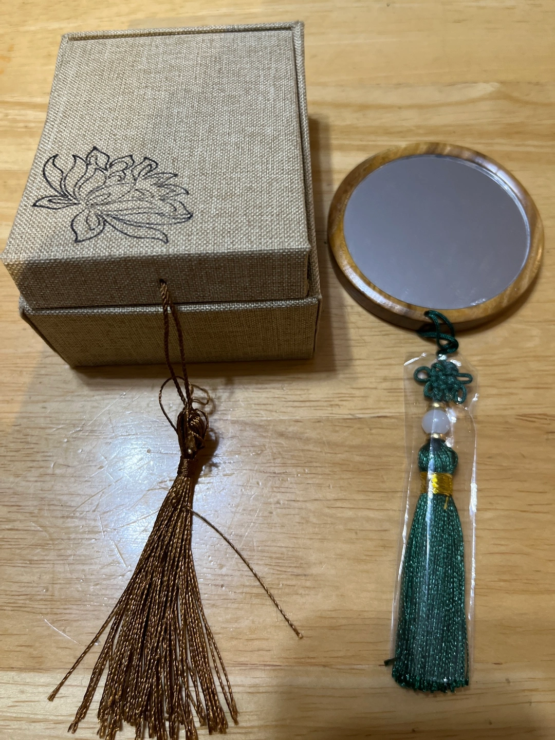 Comes with a box and a tassel. The mirror is made of wood and the back of the mirror is carved with a design. The tassel is made of green fabric and has a beaded accent. The box is made of fabric and has a floral design on it. There is a smaller tassel attached to the box.