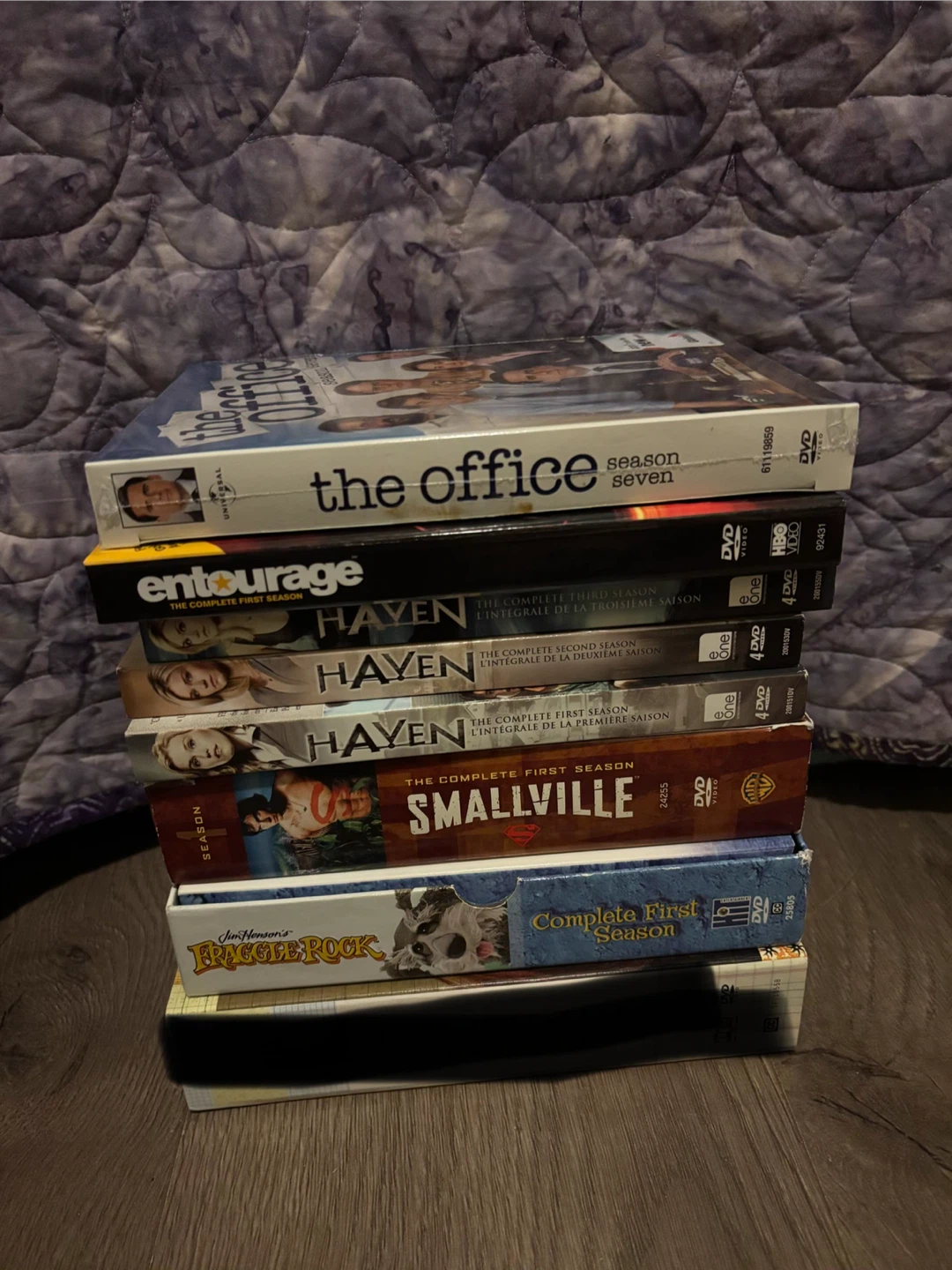 Collection of TV series DVDs including The Office Season Seven, Entourage Complete First Season, three seasons of Haven, Smallville Complete First Season, and Fraggle Rock Complete First Season. These are all complete season sets.