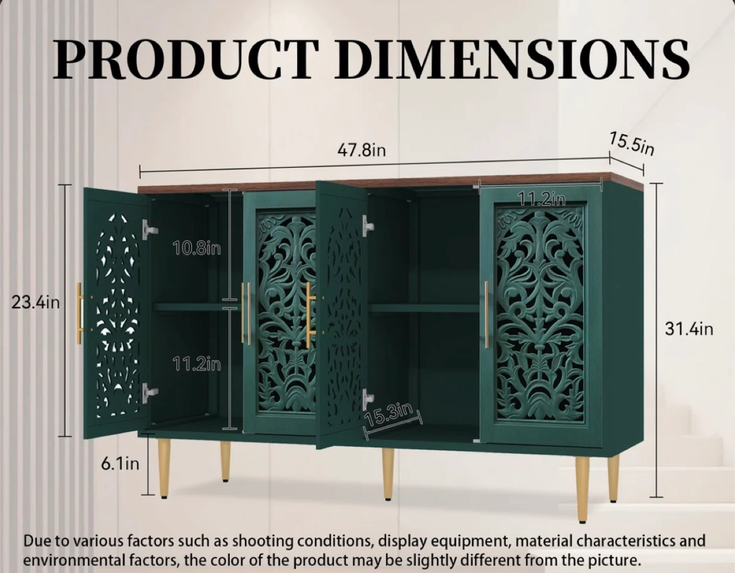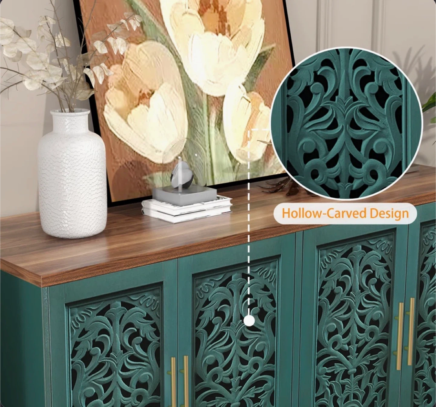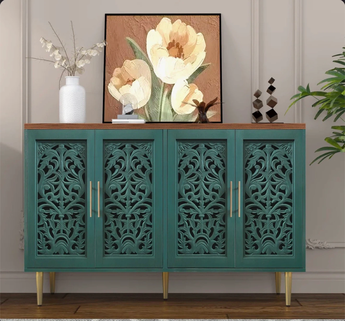 A stylish four-door sideboard in a deep green hue with intricate hollow-carved detailing on the doors. It features a wooden top and gold-toned hardware and legs. This piece offers ample storage with adjustable shelves inside.