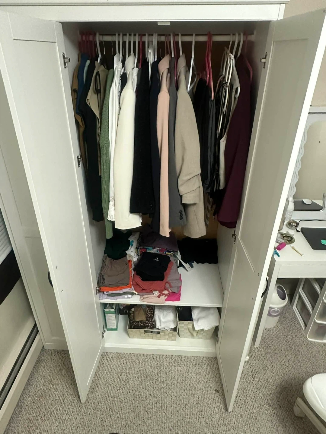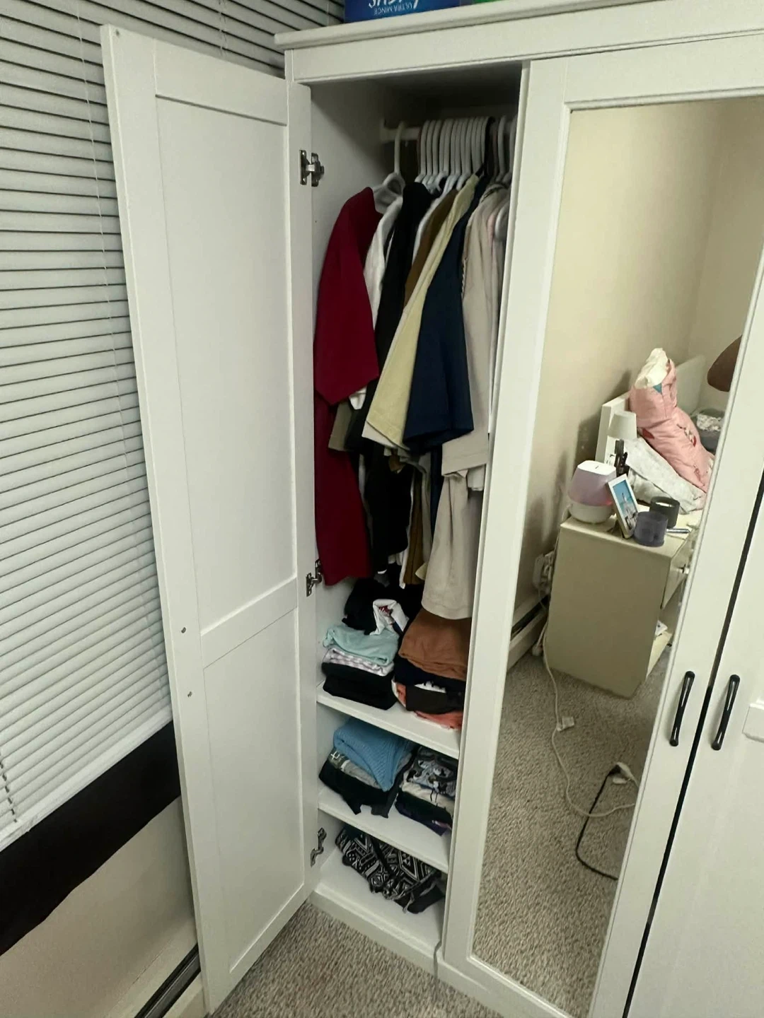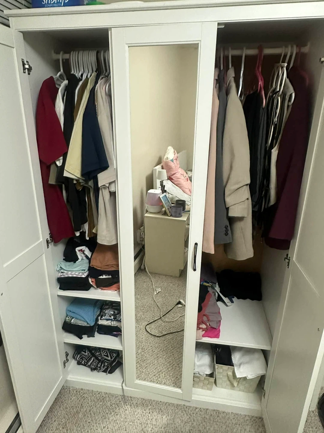 Spacious white wardrobe with three doors and a mirrored centre panel. Features ample hanging space and shelving for clothes storage. Includes two side doors and a mirrored middle door.
