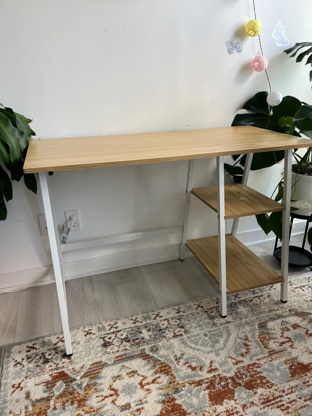 This desk features a natural wood-look top and three open shelves on the side. Its simple design makes it a versatile piece for any room. Metal frame construction.