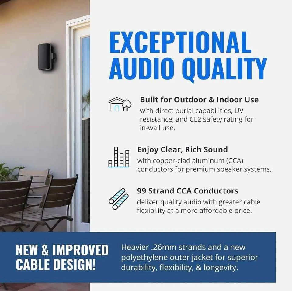 Simple Setup – Quickly and effectively install your patio speakers, car subwoofer, indoor tower speakers, and even radios using the multiconductor cable which is marked with a stripe to show polarity as well as foot count