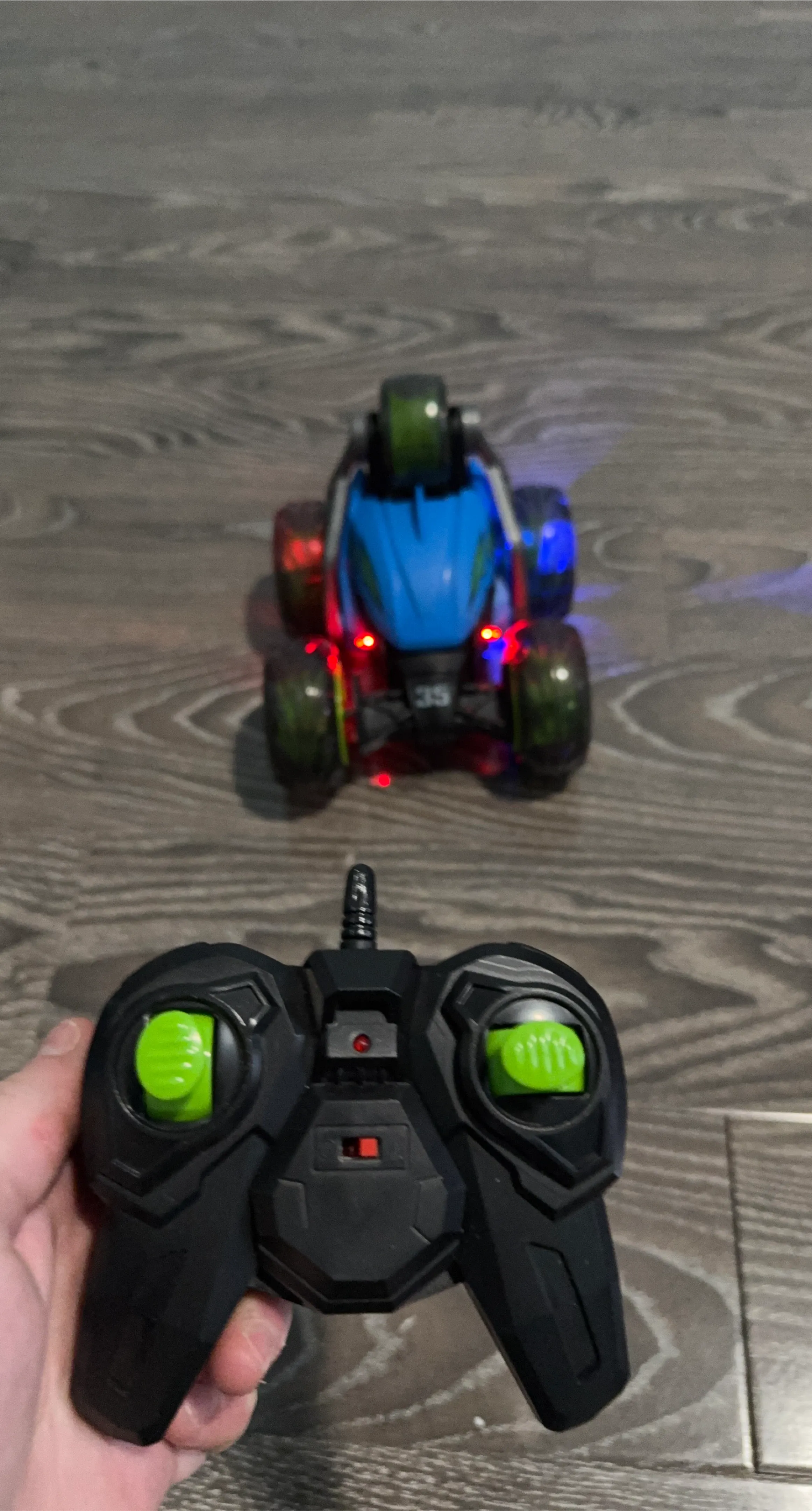 Blue and black remote control stunt car with green accents. It lights up with red and blue LEDs. Includes a black remote control with green joysticks.