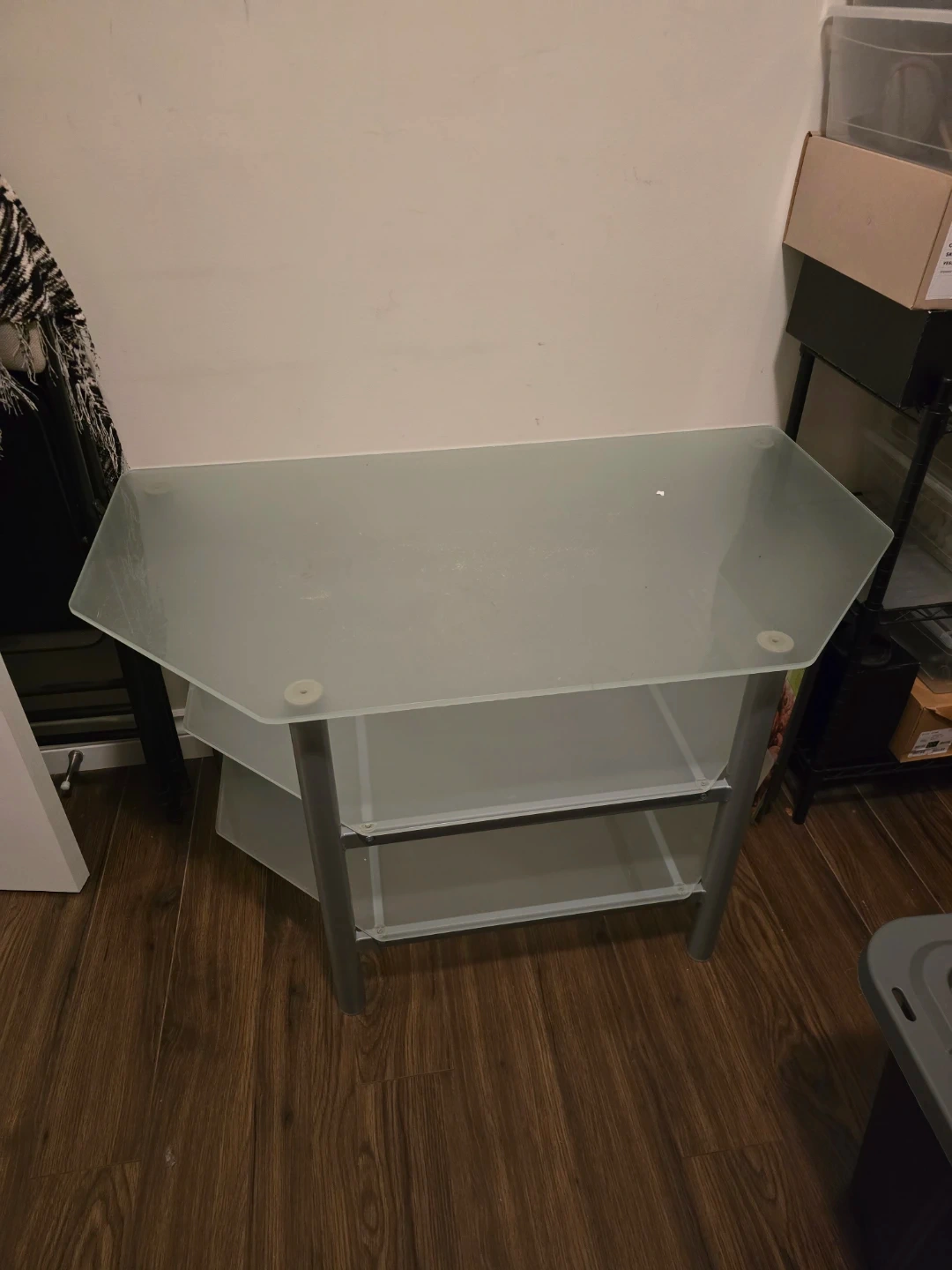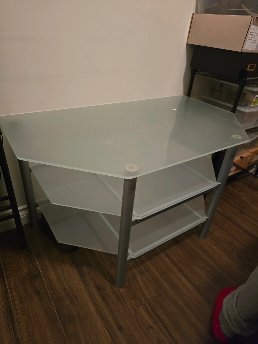 Selling a corner shelf unit with a glass top and metal frame. It has a frosted glass top and two shelves below. Perfect for adding some storage in a corner!
