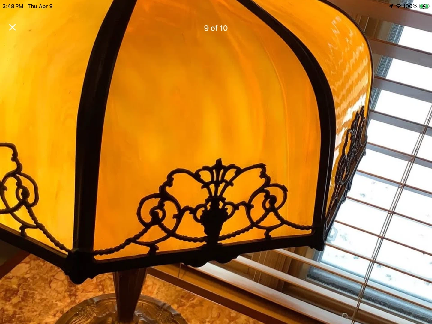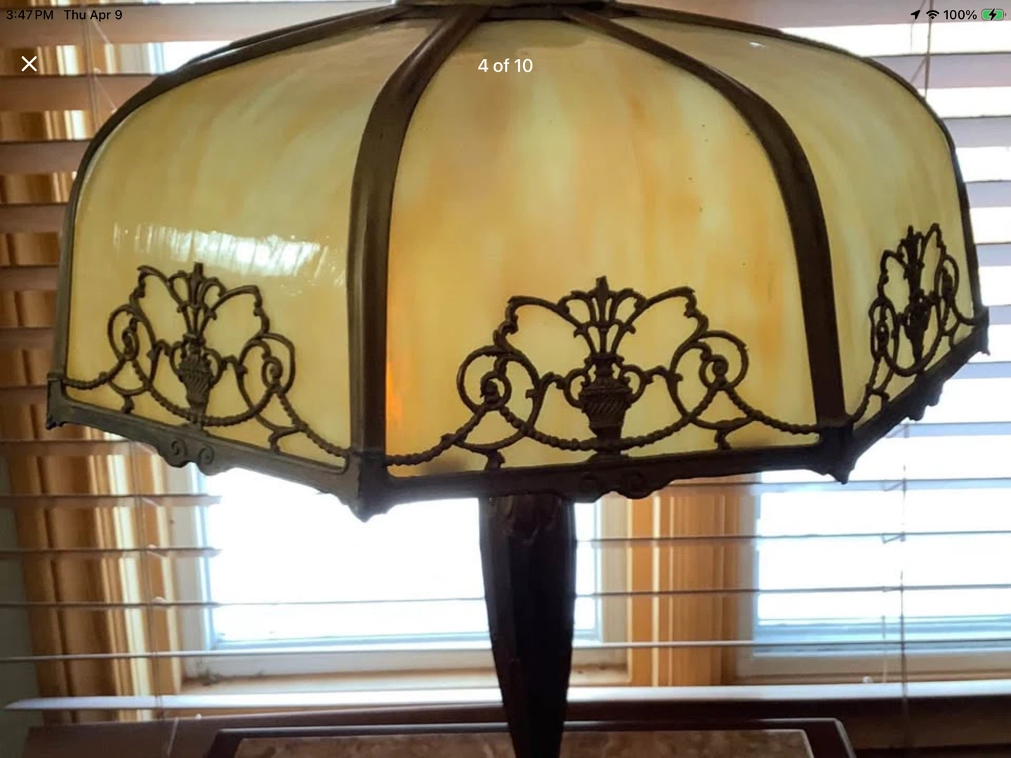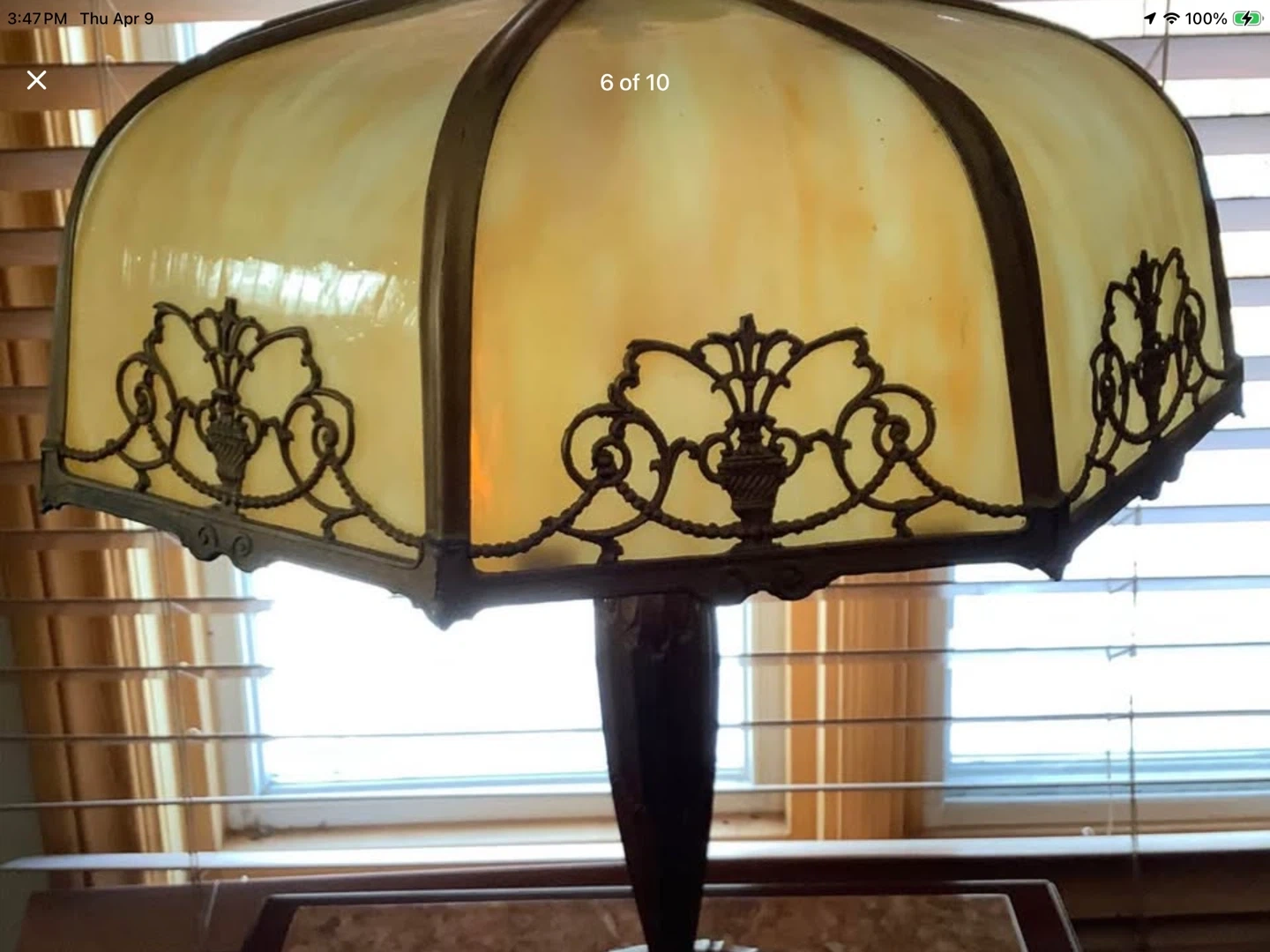 Art Nouveau Lg 6 Panel Double Lit Bent Slag Glass Lamp