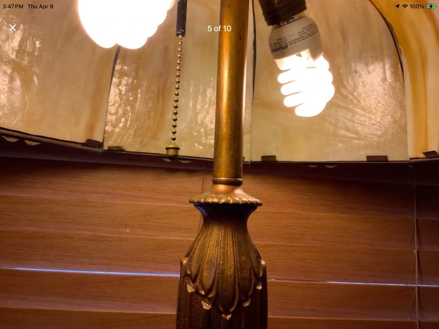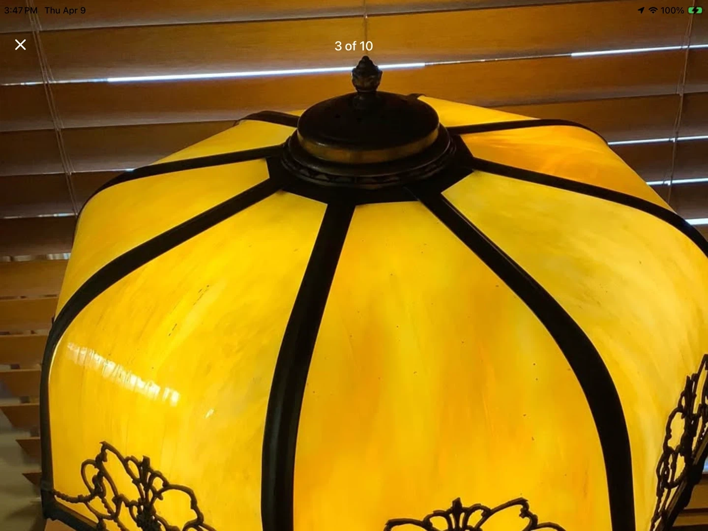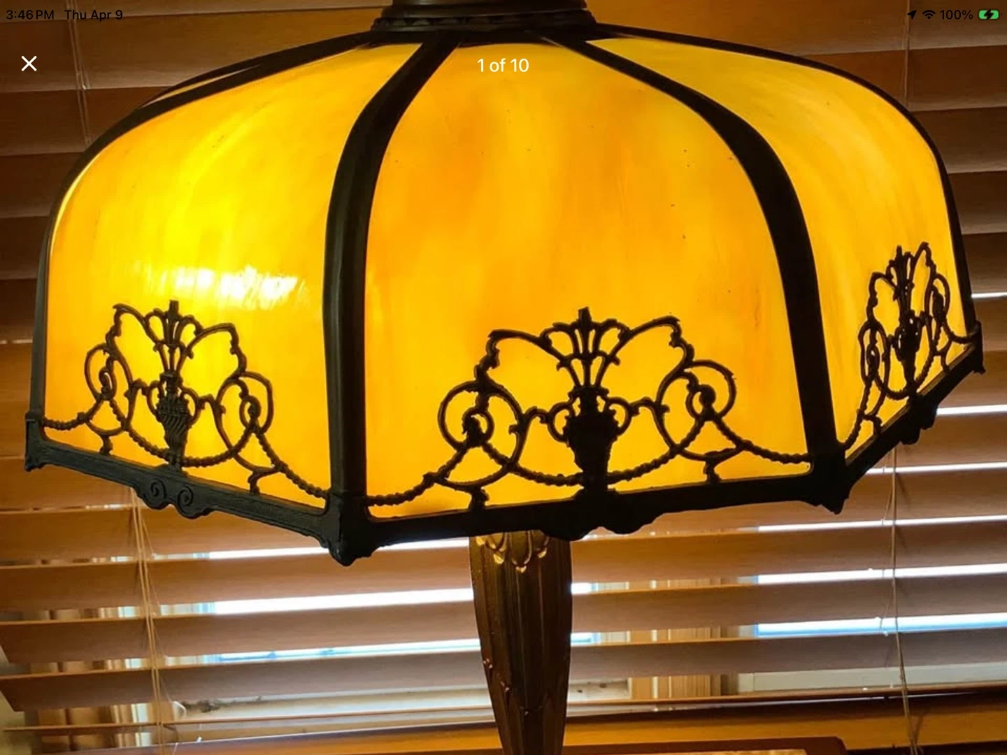 Art Nouveau Lg 6 Panel Double Lit Bent Slag Glass Lamp