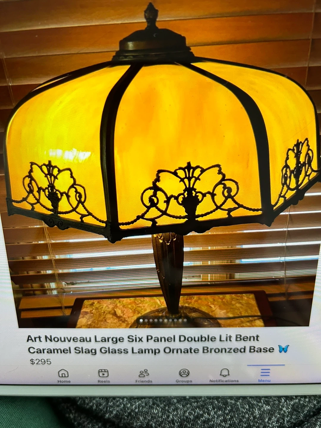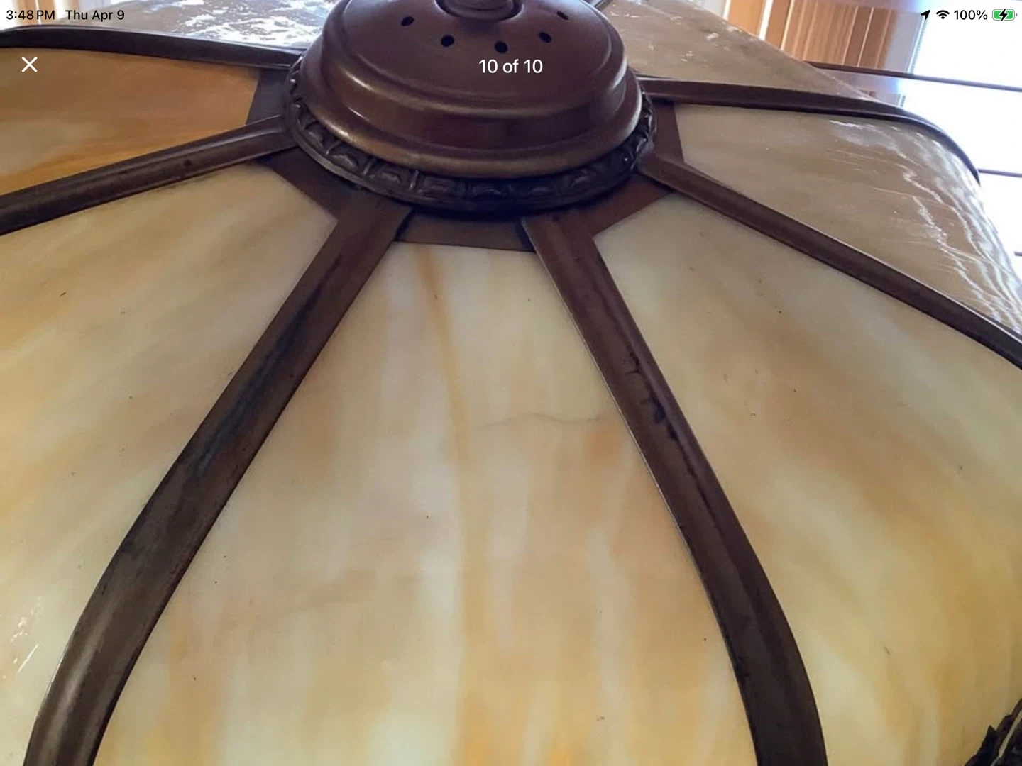 Art Nouveau Lg 6 Panel Double Lit Bent Slag Glass Lamp