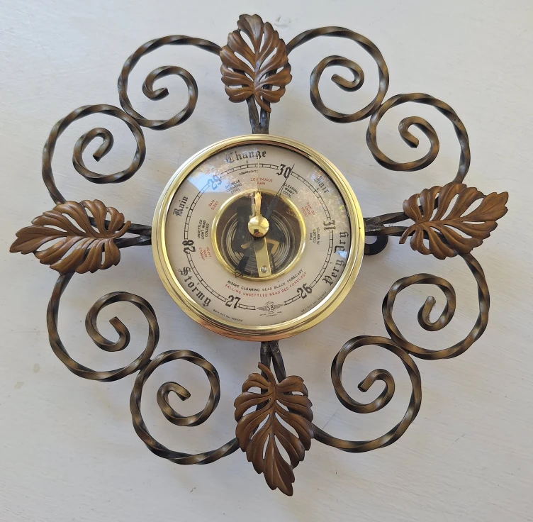 Selling a vintage Shortland British Smiths Instrument barometer. It has a decorative metal frame with leaf and scroll details. The barometer in working conditions. Diameter 8 inches with the frame