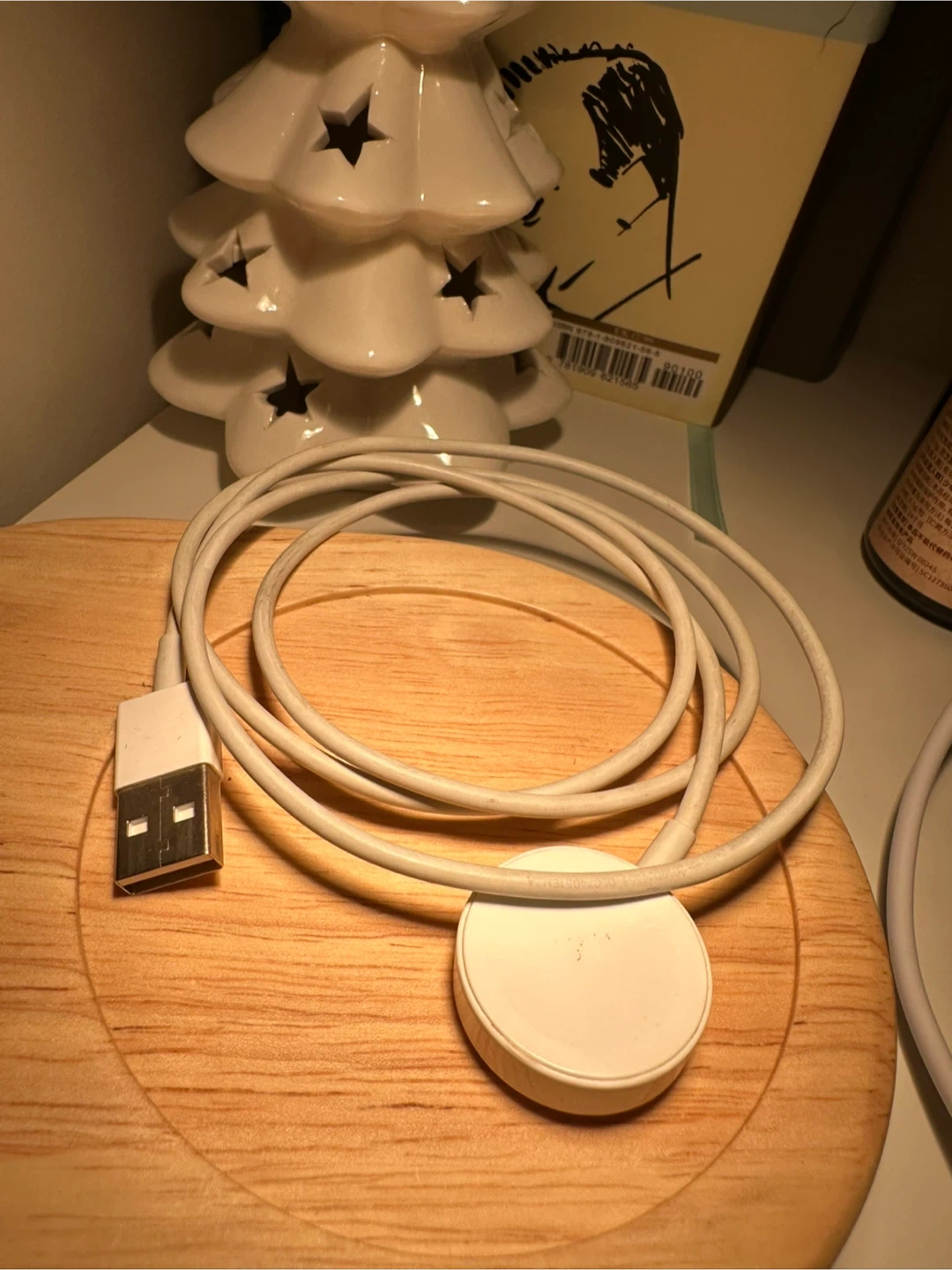 This is an Apple Watch magnetic charging cable. It features a USB-A connector and a round magnetic charging puck. Simply place your Apple Watch on the puck, and it begins charging automatically.