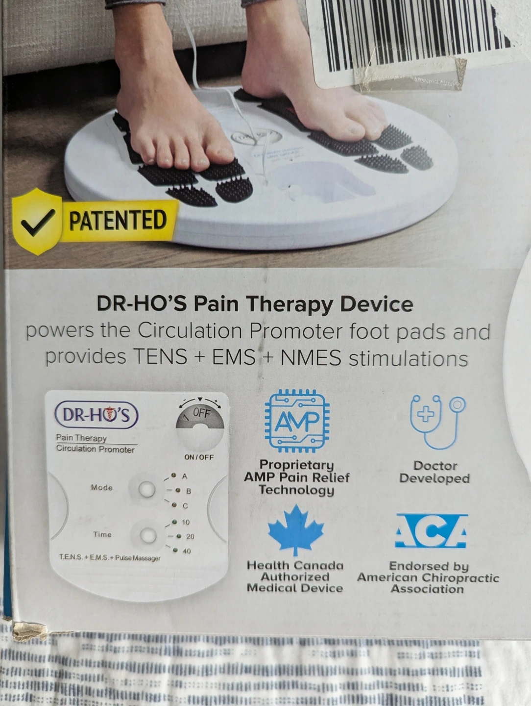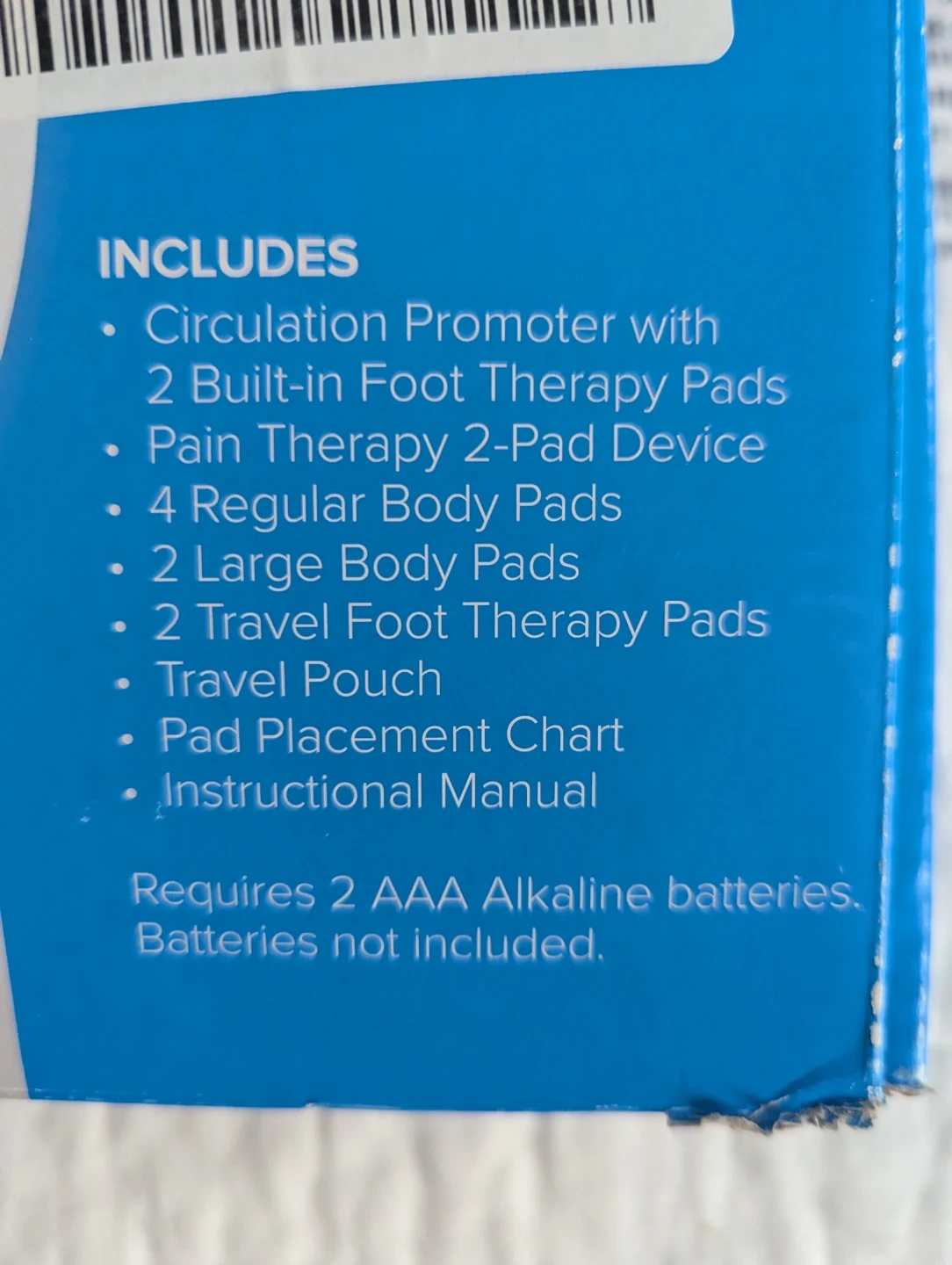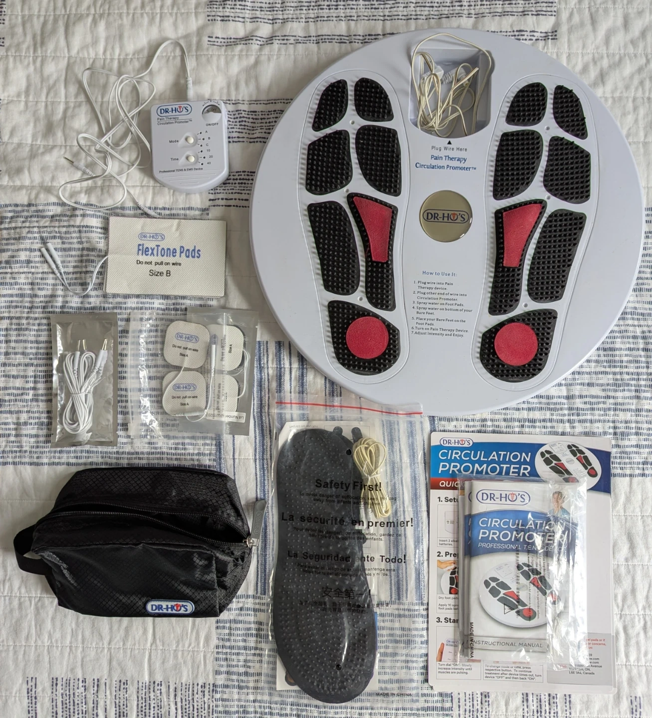 This DR-HO'S Pain Therapy Circulation Promoter comes with 2 built-in foot therapy pads and 6 additional body pads. It also includes a travel pouch and instructional manual. Requires 2 AAA alkaline batteries, which are not included.