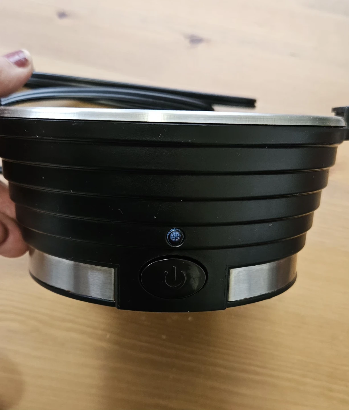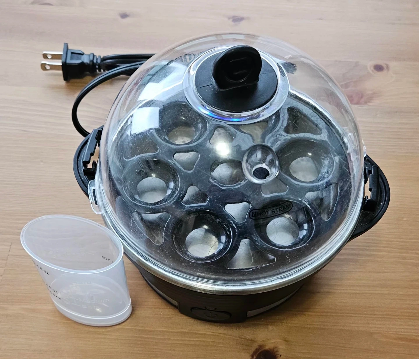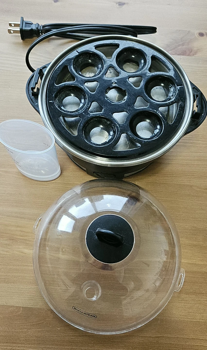 Electric egg cooker that steams up to 7 eggs at once. It's made of durable plastic and stainless steel. Comes with a measuring cup for water.