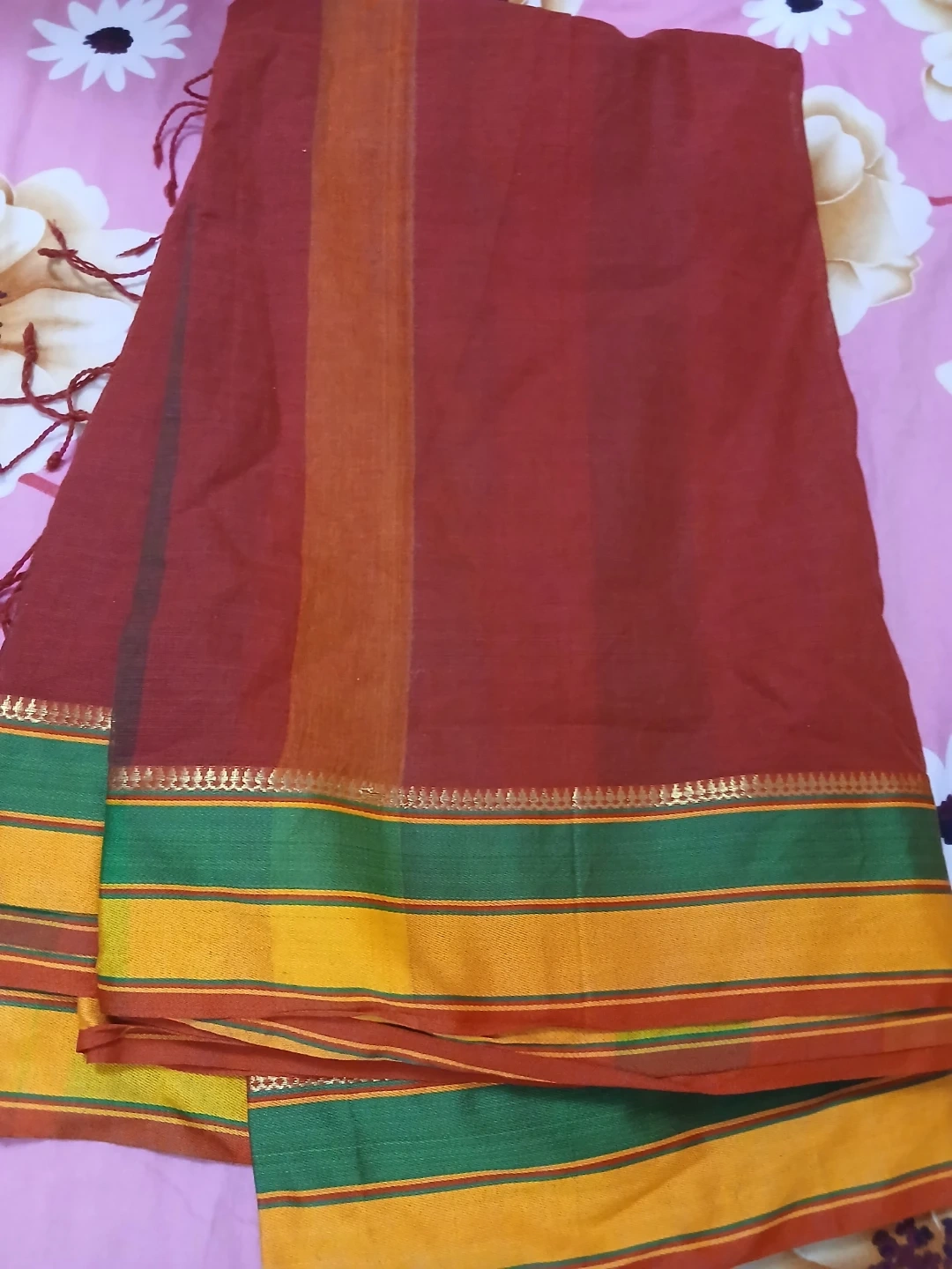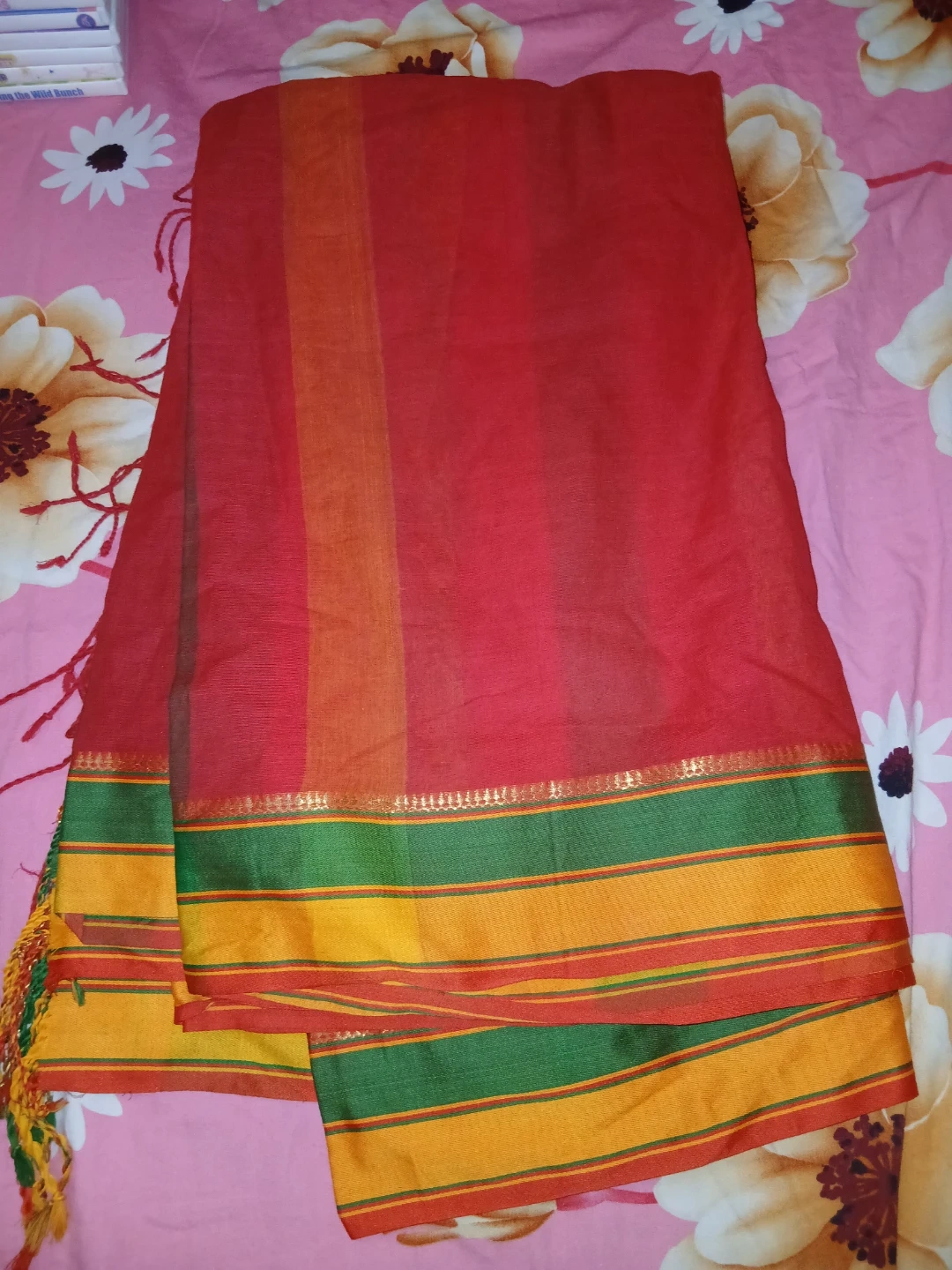 Here's a beautiful red cotton saree! It features a vibrant combination of red, orange, yellow, and green stripes along the border. The saree is made of comfortable cotton material, perfect for any occasion