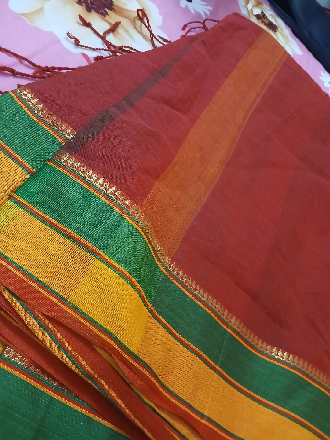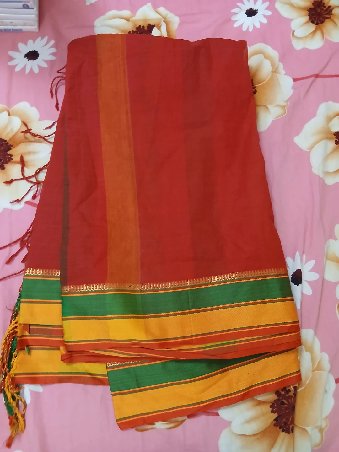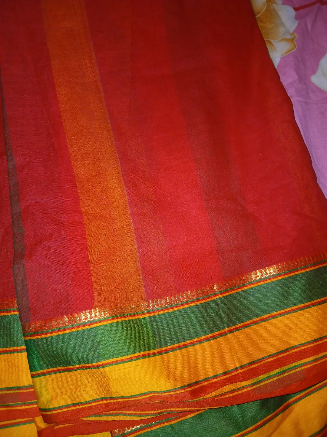 Here's a beautiful red cotton saree! It features a vibrant combination of red, orange, yellow, and green stripes along the border. The saree is made of comfortable cotton material, perfect for any occasion