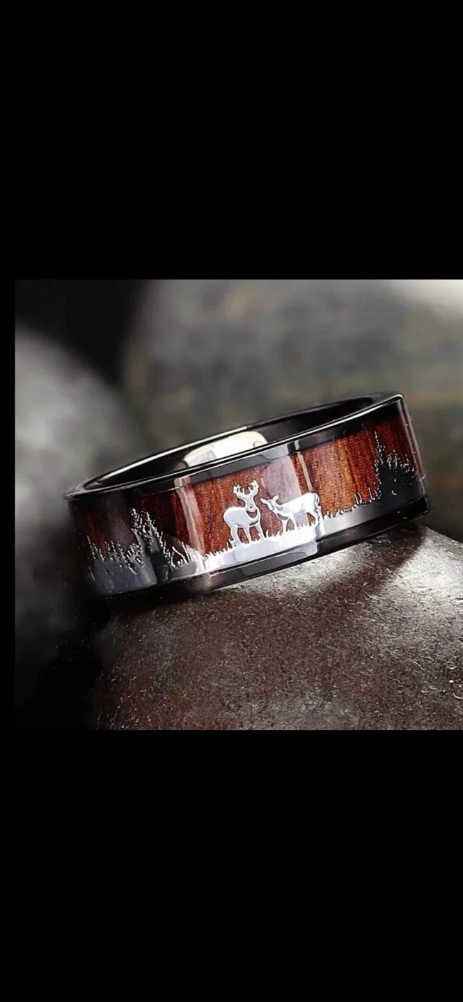 A stylish ring featuring a dark wood inlay with a silver-toned scene of deer and trees. This ring is perfect for nature enthusiasts or as a unique accessory!