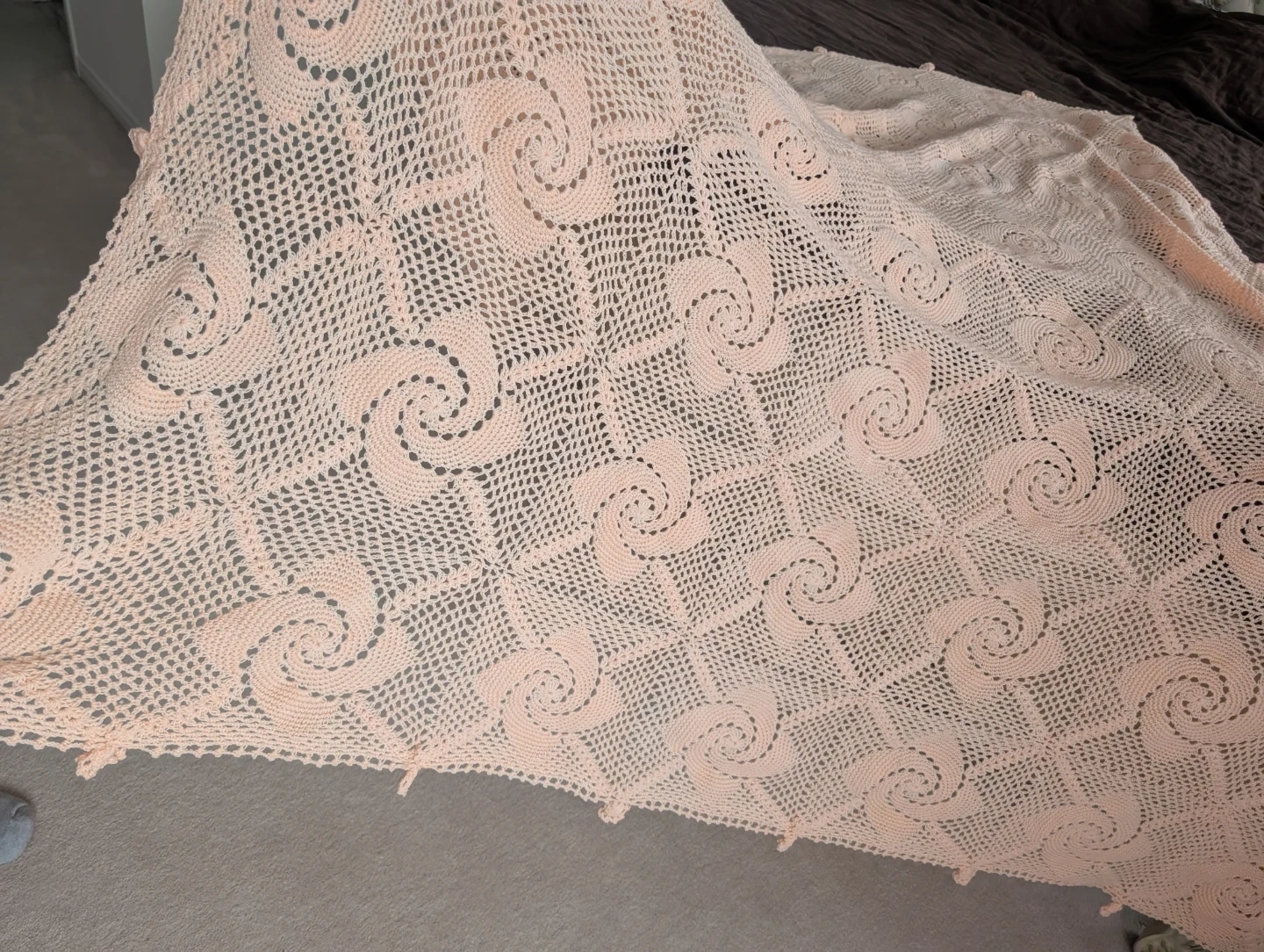 Beautiful openwork crochet blanket with circular rose/spiral motifs, 100% handmade.