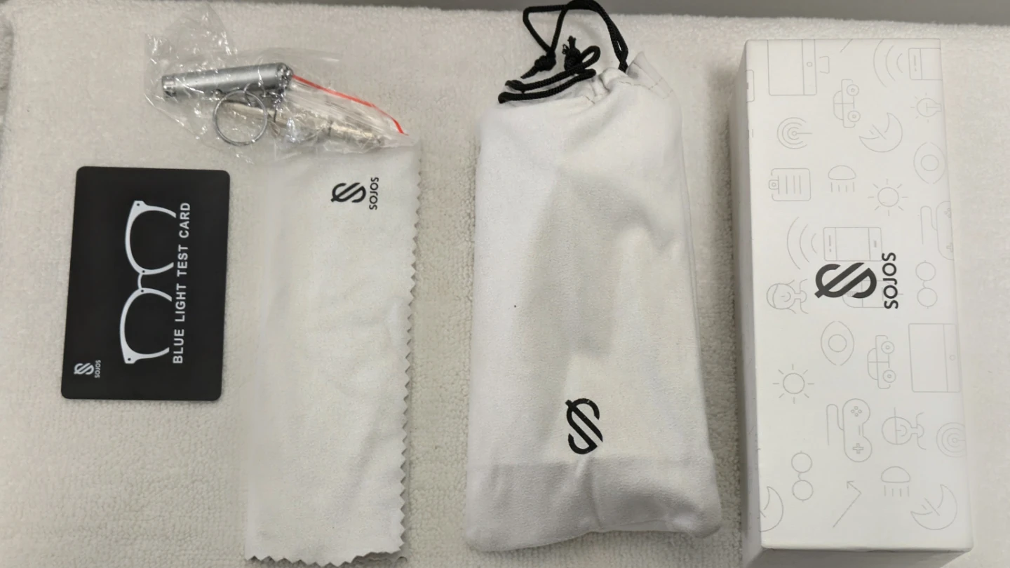 Selling a pair of SOJOS blue light blocking glasses. They're brand new and come in the original box! Includes the glasses, case, cleaning cloth, and blue light test card.
