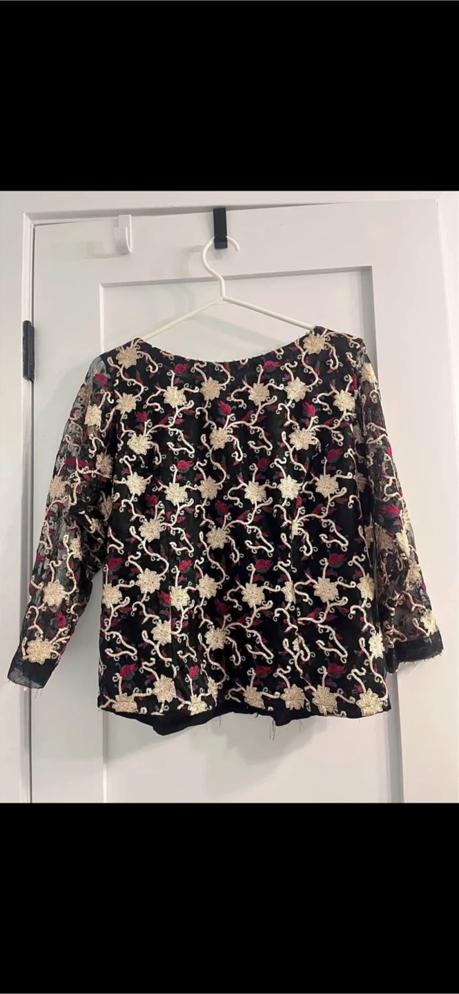 This is a women's long-sleeved blouse featuring a black lace overlay with an intricate floral embroidery pattern in gold and maroon. The sleeves have a delicate lace trim. It's a stylish piece for a night out or special occasion.