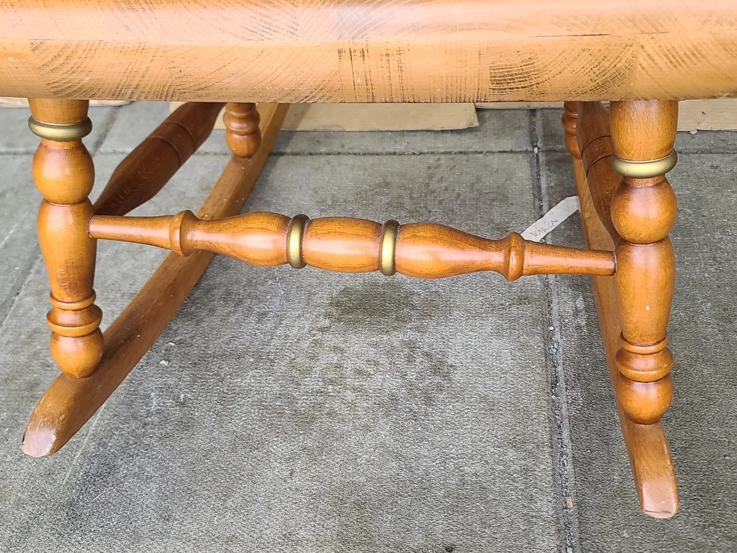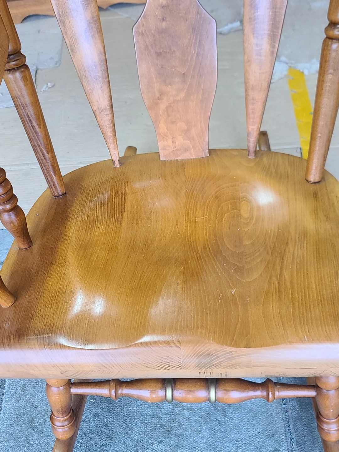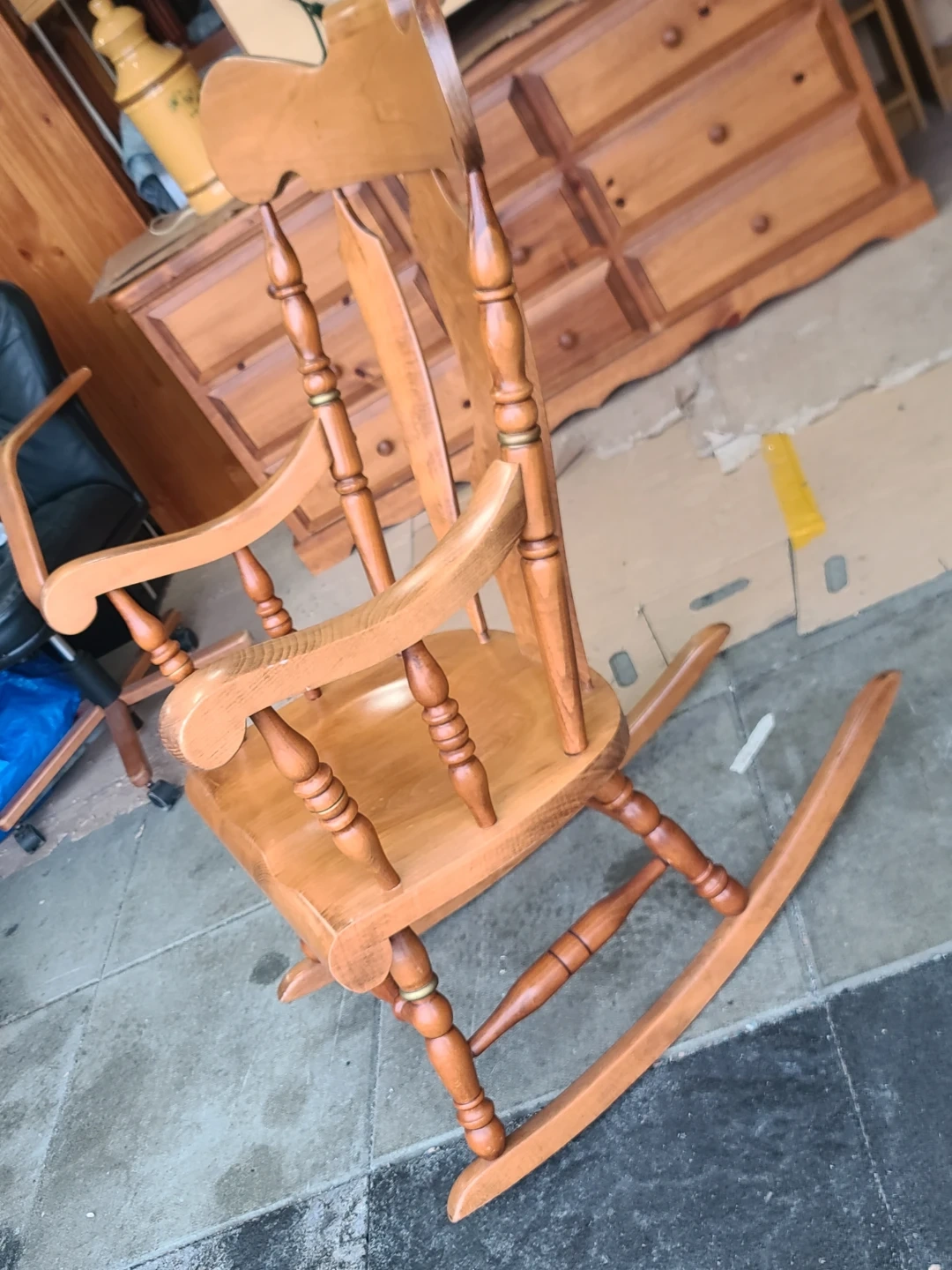 Wooden rocking chair, perfect for a living room or porch. It's made of solid wood with a warm, natural finish. The curved seat and back provide comfort while rocking. This chair is suitable for anyone looking to add a classic touch to their home. Measurements to follow. Delivery can be arranged. Viewing and pickup by appointment.