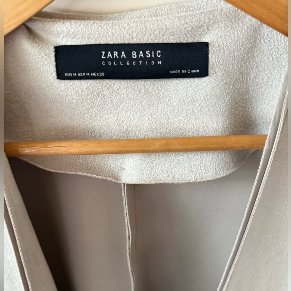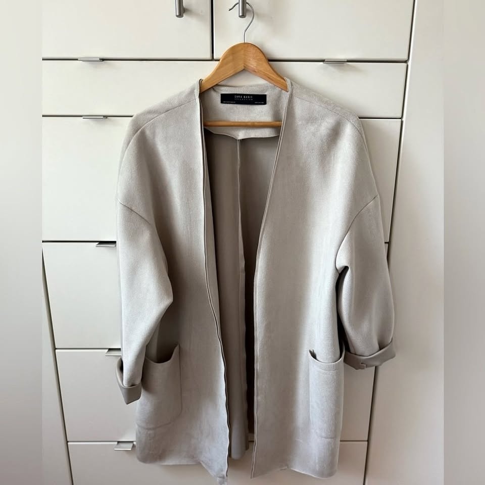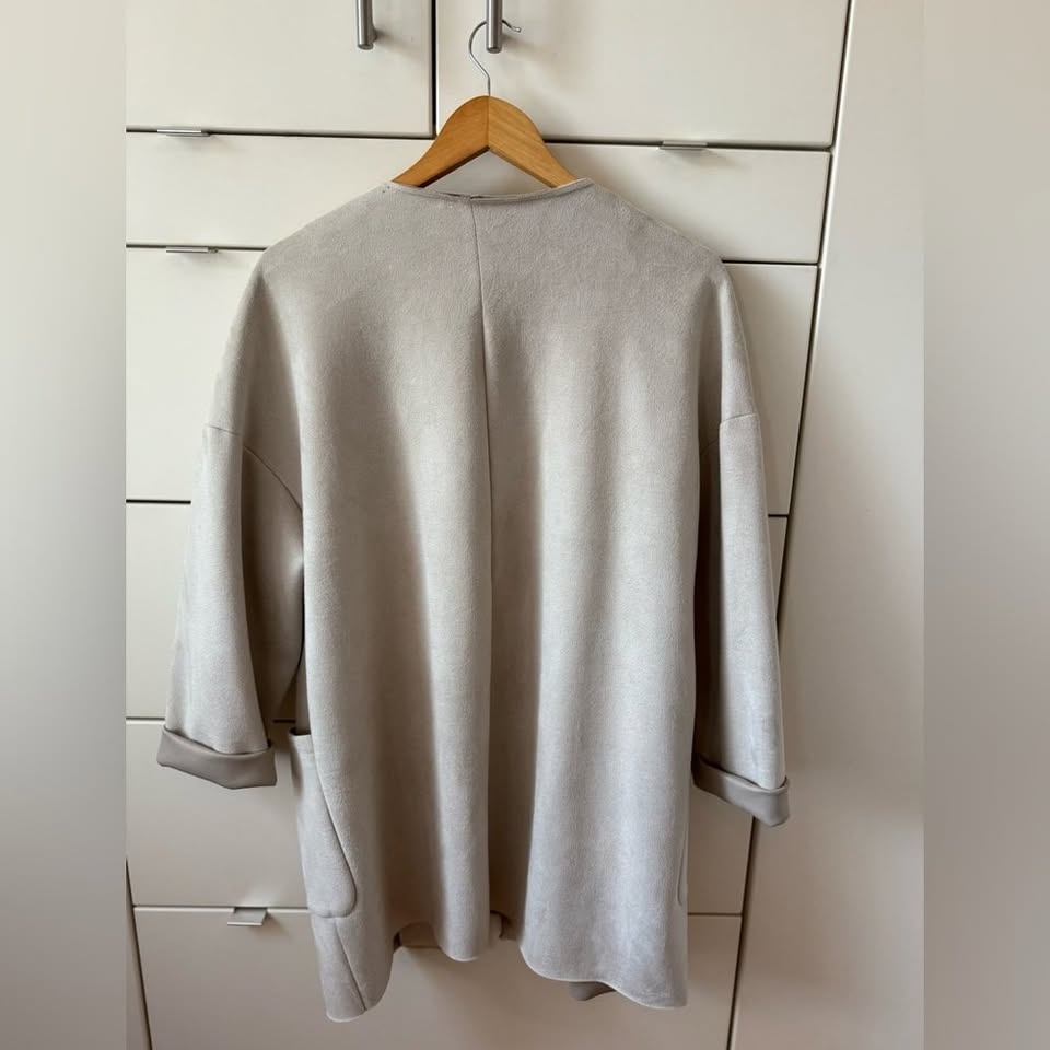Gently worn, only a handful of times. Soft suede-like material in a beautiful neutral tone, perfect for layering or dressing up any outfit. Oversized, relaxed fit with timeless style.