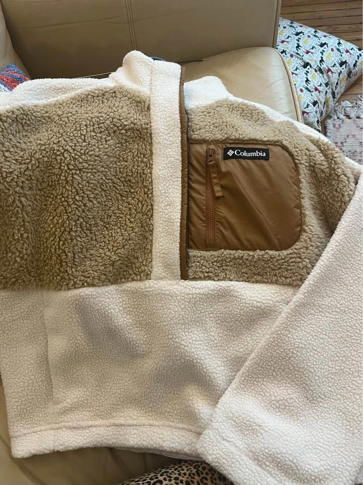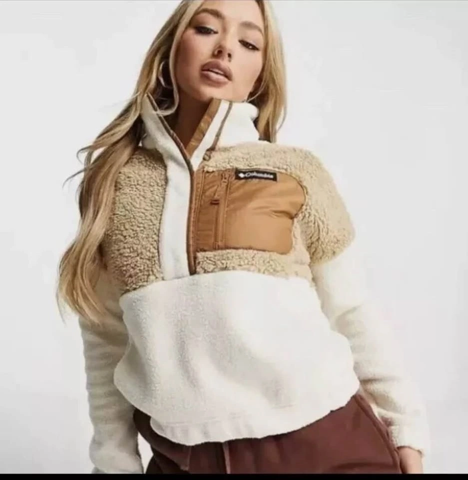 Worn once and been in storage. Super soft Sherpa fleece and a nice neutral cream and tan colour. Oversized relaxed fit, slightly cropped. Pullover Sherpa-like outer 1/2 Snap button closure on front Zipper pocket on chest Tan accents on upper chest Collar Cropped length Front pouch pocket. Let me know if you're interested!