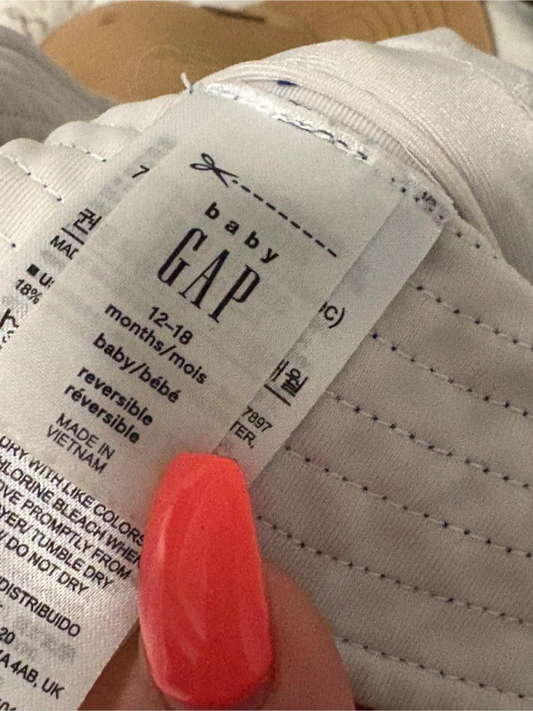 This is a Gap baby bucket hat. It's reversible and suitable for babies aged 12-18 months. Made in Vietnam.