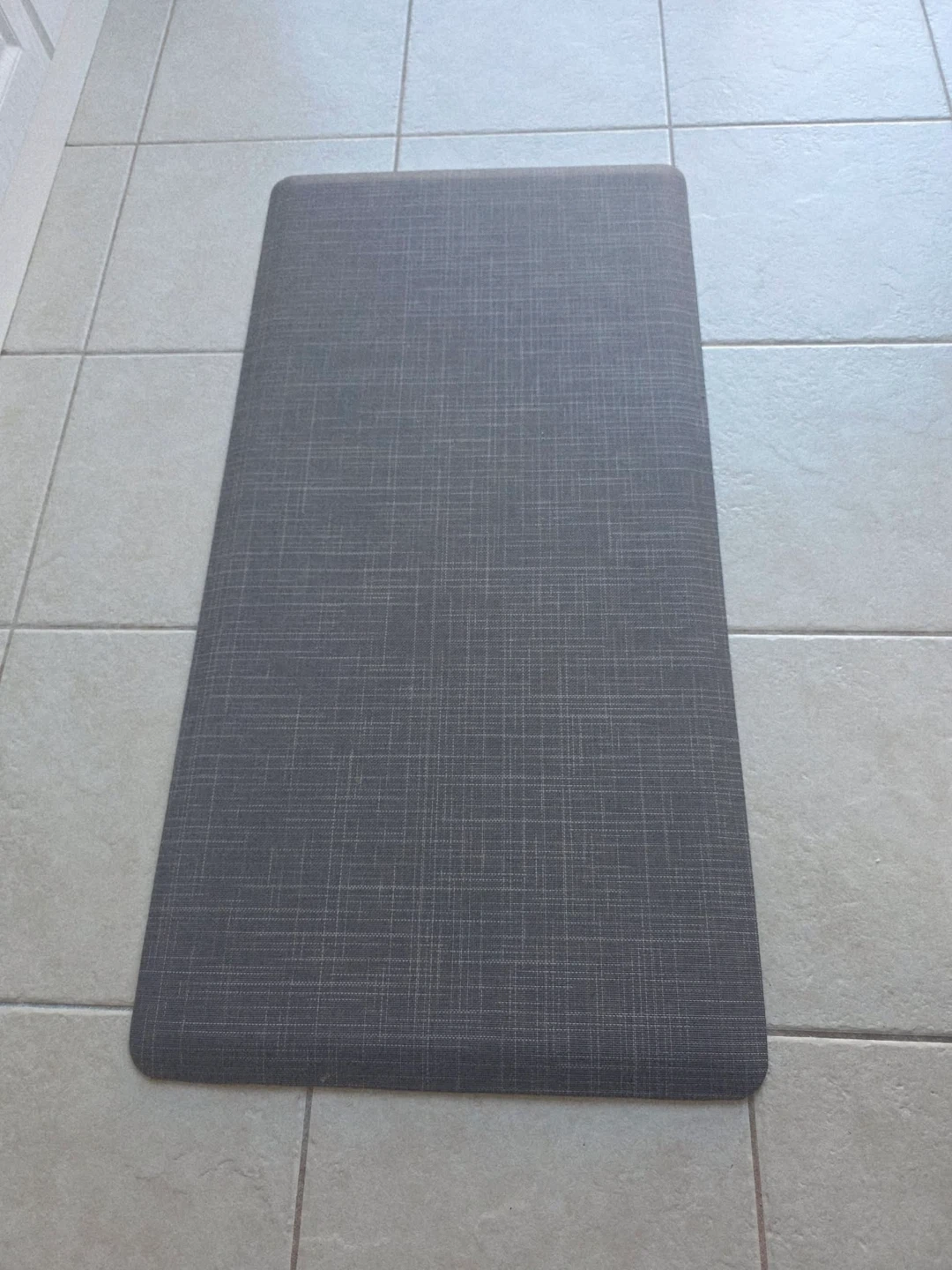 This is a grey kitchen comfort mat. It's designed to provide cushioning for standing. The top surface has a subtle textured weave pattern.