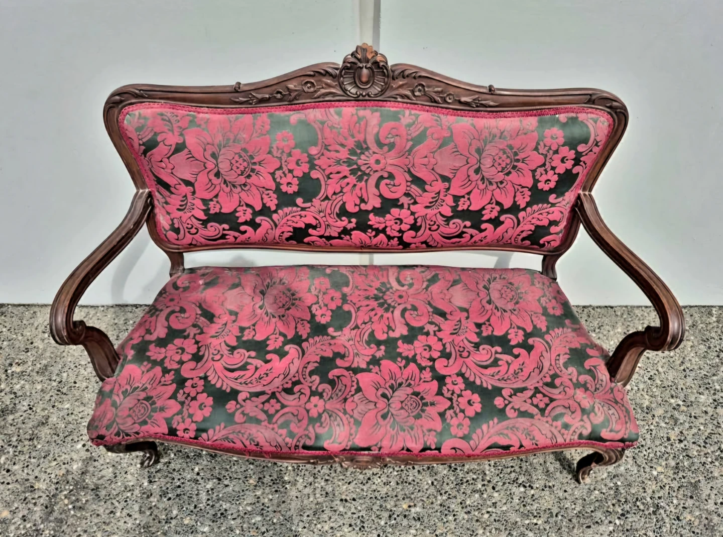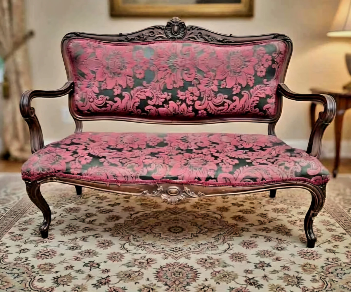 Ornate dark wood frame with intricate carvings and cabriole legs