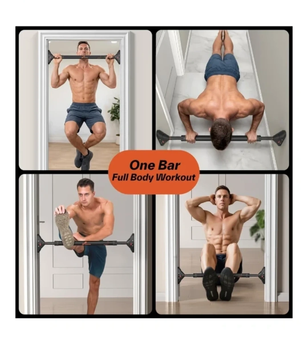 Strength training chin-up bar without screws. Features a width locking mechanism and non-slip design. Max load 440lbs for home gym upper body workouts.